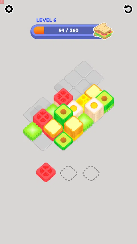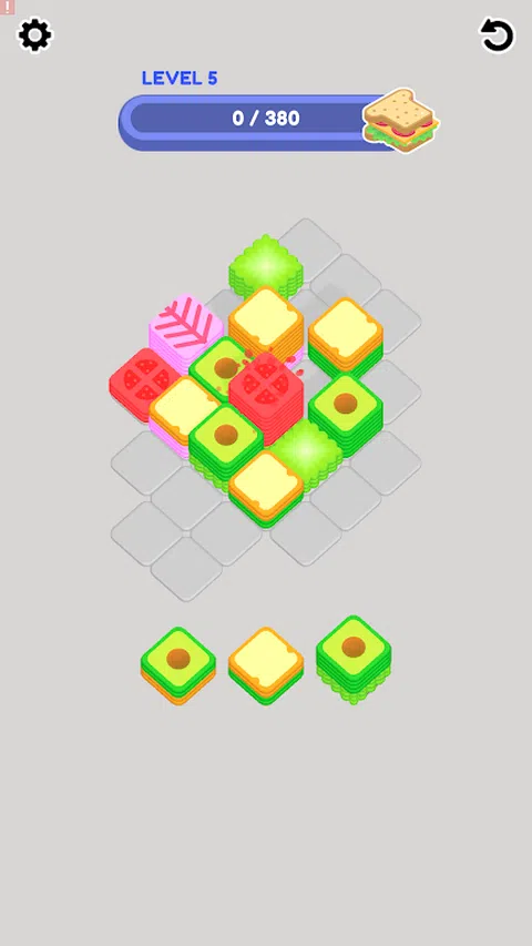 在这款令人上瘾的超休闲游戏中,您的任务是堆叠令人垂涎的食材,如脆皮生菜、咸味牛排、粘糊糊的奶酪和软面包片,以创造出完美的高耸三明治。拖放每种成分以创建相同物品的堆叠并达到目标