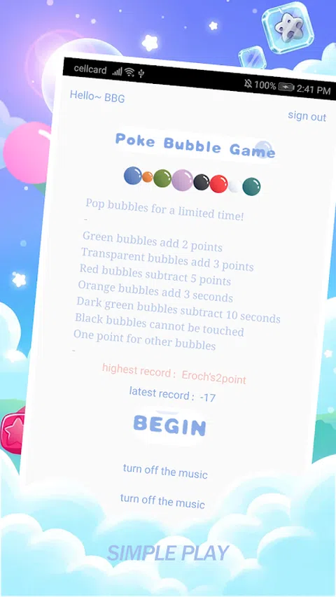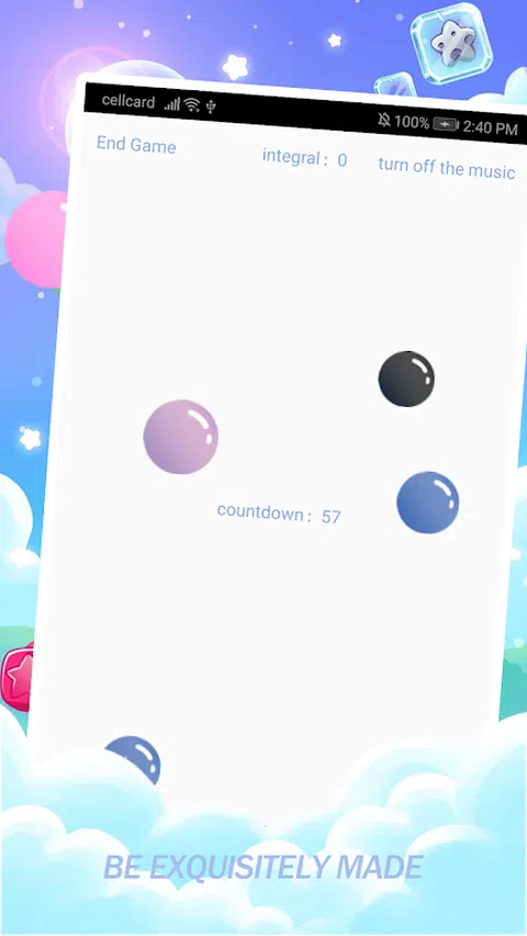点击“开始”开始游戏,屏幕上会出现 7 个不同颜色的泡泡,请快速弹出它们,一个泡泡计 1 分,在有限的时间内弹出的泡泡越多,得分越高,但请注意,不要点击黑色的泡泡,否则游戏将直接结束
