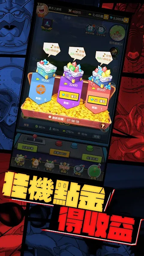《神龙降临:宇宙激斗》是一款收集卡牌,放置对战的策略游戏。在游戏里你可以招募来自世界各地的英雄,通过收集装备和材料让英雄变得更强大。游戏登录第二天可领取强力前排,第七天可领取高战力英雄。为了实现愿望、突破自己、变得更强,和伙伴们开启大世界的浪漫冒险吧! 【回合制卡牌激斗】 游戏简单易上手,轻松点击即可体验放置的乐趣。收集各种稀有英雄卡牌,制定高效战术策略,合理放置英雄站位,享受来自英雄战斗带来的视听盛宴吧! 【上线享多重福利】 每周优惠的礼包,以及每月丰富的主题活动在等着你。福利礼包领到手软! 【参与热血军团战】 和全世界玩家实时通讯实时对战,和好朋友组建军团,开启军团间的对抗团战,为军团赢得最高荣誉! 【挂机点金得收益】 放置挂机领取时长收益,轻轻松松给英雄升级。享受简单又充实的成长体验! 【探索奇妙大世界】 探索奇妙的大世界,各种玩法丰富多样,和好友一起开启大世界的冒险吧