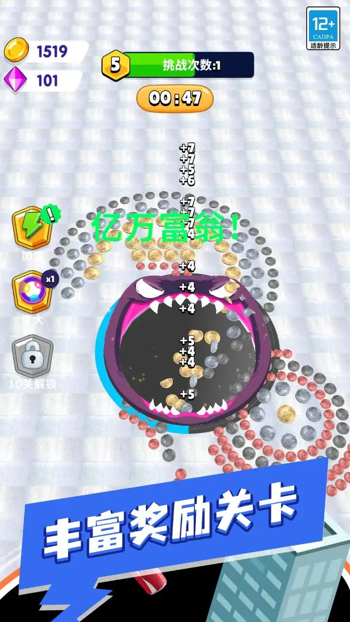 《黑洞大作战》是一款休闲解压,考验操作的创光游戏。游戏中玩家将控制黑洞,在规定时间内吸收场景中的所有物品。游戏涵盖了超多类型场景,合理规划自己的行进路线,在时间内吸收所有物品。当然,你也可以升级黑洞的各项属性,当黑洞足够大时,轻轻松松就能吸收所有物品。 游戏玩点 1.控制黑洞,操作简单,帮助你释放压力。 2.升级加强黑洞的各项属性,收集场景中的所有物品。 3.好用的辅助道具,依据个人习惯自由选择。 4.适合各个年龄段玩家,锻炼反应能力和规划能力。 游戏亮点 1.种类丰富的黑洞皮肤,挑选心仪款式。 2.免费场景道具,一定不要错过!