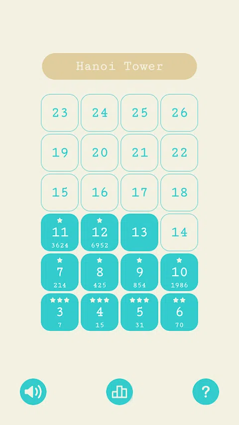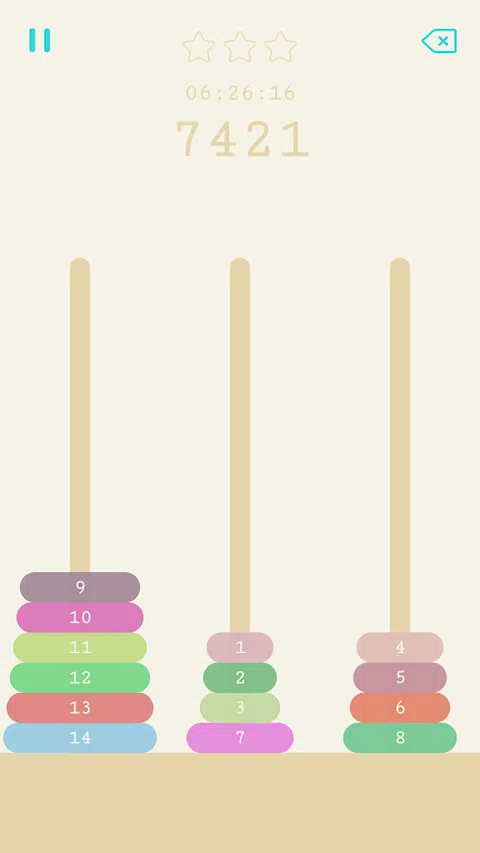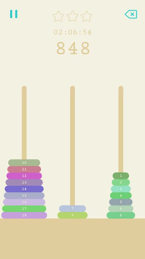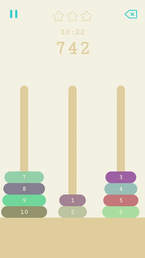 汉诺塔,又称河内塔,是一个年代久远的经典益智游戏。 汉诺塔玩法如下: 1. 分别有左、中、右三根柱子。 2. 左柱上叠放着按大小顺序排列的多个圆盘。 3. 左右滑动屏幕移动盘子。 4. 不能出现大盘子在小盘子上方。 4. 可以使用中柱作为暂时存放。 5. 全部盘子移动到右柱上获胜