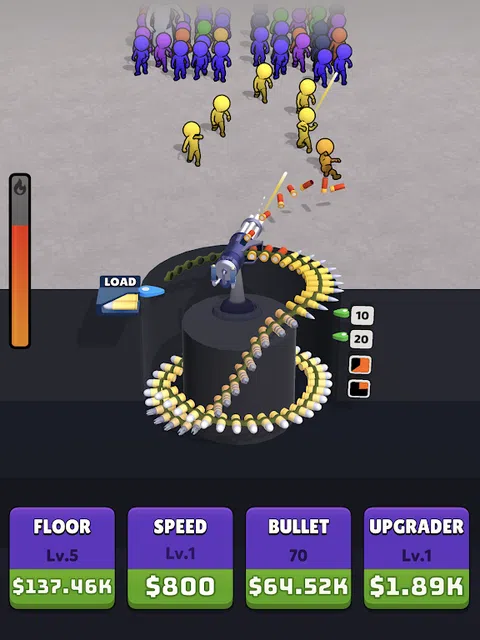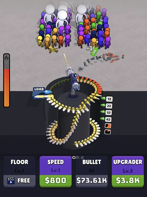 随着游戏的进行,改进子弹并对敌人造成更多伤害。 用消灭敌人时赚取的硬币升级弹药带和子弹。 每次升级,您的子弹都会变得更加致命,对敌人造成毁灭性打击。 点击屏幕时提高射击速度。更多点击,更多子弹