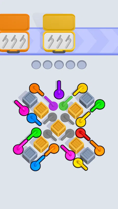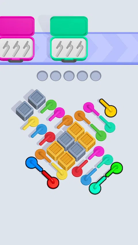 解开手柄并将它们放入匹配的彩色盒子中。 点击手柄将它们移出面板并放入相应的盒子中。只有在有足够空间的情况下才能扭转手柄,因此请注意障碍物和棘手的空间