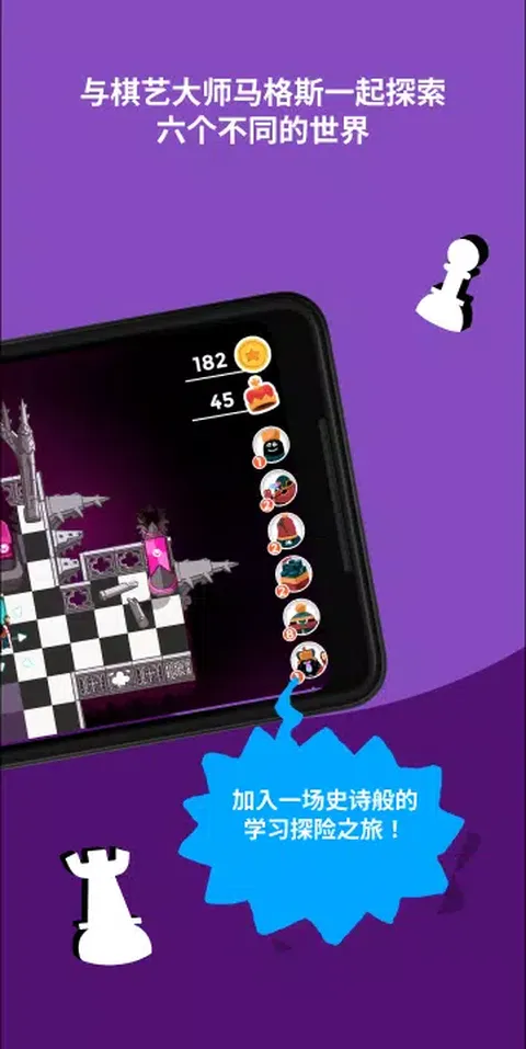 加油!《DragonBox学习国际象棋》是一款身临其境的互动游戏,适合儿童(推荐5岁以上)和想要学习下棋并挑战思维的成年人。加入大师马克斯的冒险之旅,解决难题并击败多个级别的老板”。完成冒险后,您就可以与朋友和家人进行现实生活中的战斗,争夺大师头衔! *需要订阅* 访问此应用程序的内容和功能需要 Kahoot!+家庭或高级订阅。订阅从7天免费试用开始,可以在试用结束前随时取消。 卡胡特!+家庭和高级订阅让您的家人可以访问高级Kahoot!功能和一系列屡获殊荣的学习应用程序。 冒险学习 Kahoot的主要目标!DragonBox Chess旨在向初学者介绍国际象棋规则和策略,以便他们可以将这些知识和技能应用到真实棋盘上。 通过流畅的游戏进程,您将了解每个棋子,同时与大师马克斯一起探索六个不同的世界。一步一步地,您将用越来越多的棋子解决国际象棋情况,并学习应用越来越多的国际象棋规则。最终,你会遇到老板,他们挑战你在国际象棋游戏中使用你的新技能。 教学步骤 - 了解不同的棋子如何移动和捕捉。 - 学习将死的概念和简单的将死模式。 - 学习完成简单的战术和战略任务。 - 介绍对抗孤独王的基本将死技术。 - 完整的游戏与基本的国际象棋引擎。 加油