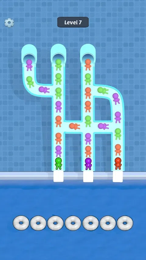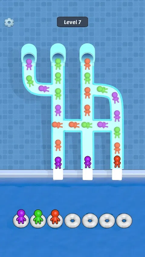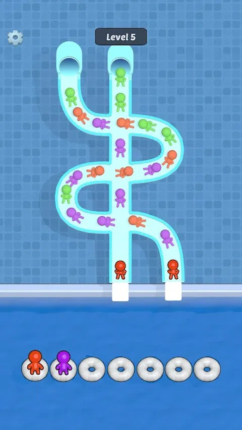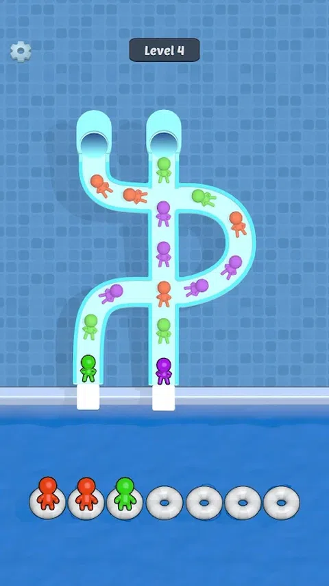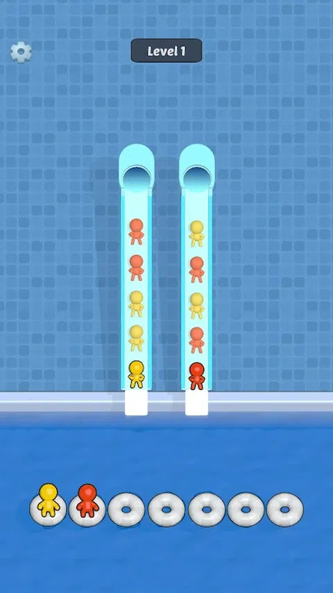 点击以从滑梯跳入泳池。匹配三个相同颜色的字符。清除幻灯片中的所有角色以完成关卡