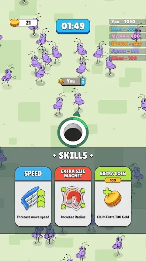 体验经典 io 游戏的快感!控制一个洞对象并在充满虫子的动态环境中导航。吞噬虫子变大,每次升级时从三张随机升级卡中进行选择。吃掉比你小的动物,避开比你大的动物,智胜你的对手。助推对象出现在地图的特定区域,提供强大的增强功能,帮助您主宰游戏。你能成为竞技场中最大最强的洞吗?立即游戏并找出答案