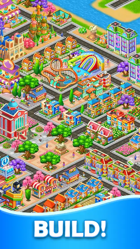 小镇大亨(Town Tycoon)是一款将城市建设和商业管理无缝融合的休闲模拟游戏,建造你的梦想小镇,成为商业大亨! 在这个充满活力的虚拟世界中,您将轻松地合并各种物品,完成居民的订单,并积累资金。有了这些资金,你可以建造房屋、农场、工厂和社区建筑,为你的小镇注入活力。而且,你可以自由地用各种装饰品装饰你的城镇,赋予它独特的魅力和活力。 随着城镇的不断发展,你将有机会建造火车站、机场和港口,开启全球贸易的新篇章,将你的产品销往世界各地。同时,招募管理者精心管理农场和工厂,进一步推进城镇的繁荣。 游戏特色: - 合并物品,完成订单,逐步建造你的梦想小镇。 - 升级能量系统,解锁更多物品,增加订单收益。 - 建造邮局,雇用快递员,为居民提供送货服务。 - 招募经理来高效管理农场和工厂。 - 自由装饰你的城镇,利用埃菲尔铁塔、自由女神像等世界著名地标建筑,打造独一无二的城市景观。 - 修理和运营火车站,通过火车贸易将产品运输到其他城镇。 - 修复机场,通过飞机发送订单,获得丰厚奖励,加速城镇发展。 - 解锁并开发荒地,扩大城镇领土。 加入小镇大亨,踏上你的城市建设和商业经营之旅,让你的梦想小镇在你手中大放异彩
