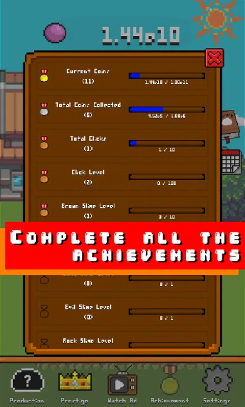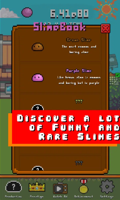史莱姆农场是一个增量游戏,目标是成为世界上的史莱姆农场主,你能做到吗? 培育不同的史莱姆并从中赚取越来越多的钱。这些史莱姆中的每一个都有独特且非常可爱的设计。通过 SlimeBook,您可以发现这些史莱姆的秘密。借助 Prestiges 升级您的生产,这将为您提供宝石,从而为您提供动力。尽可能多地完成目标。完成目标一定次数后,获得铜牌、银牌、和可解锁的特殊奖牌。 从头开始,成为世界上的史莱姆饲养员