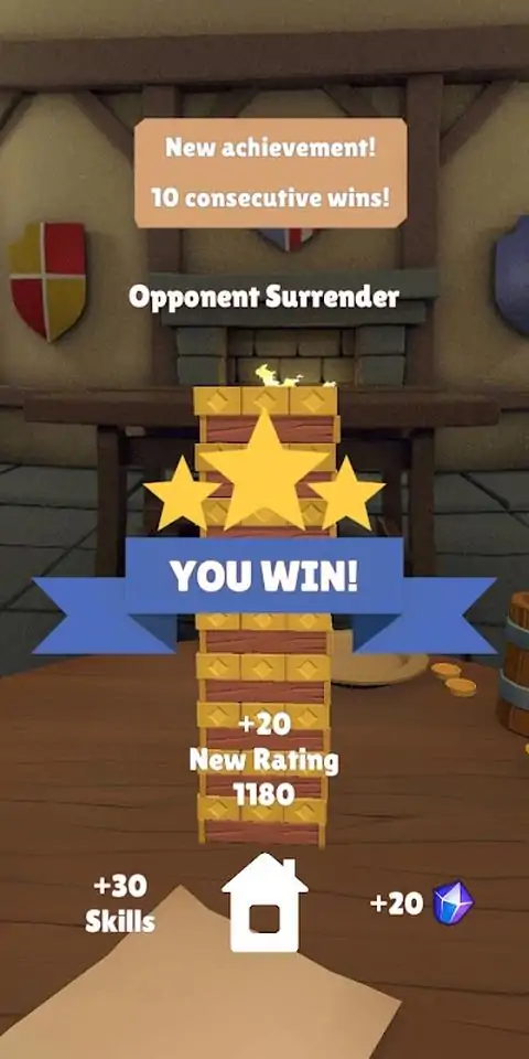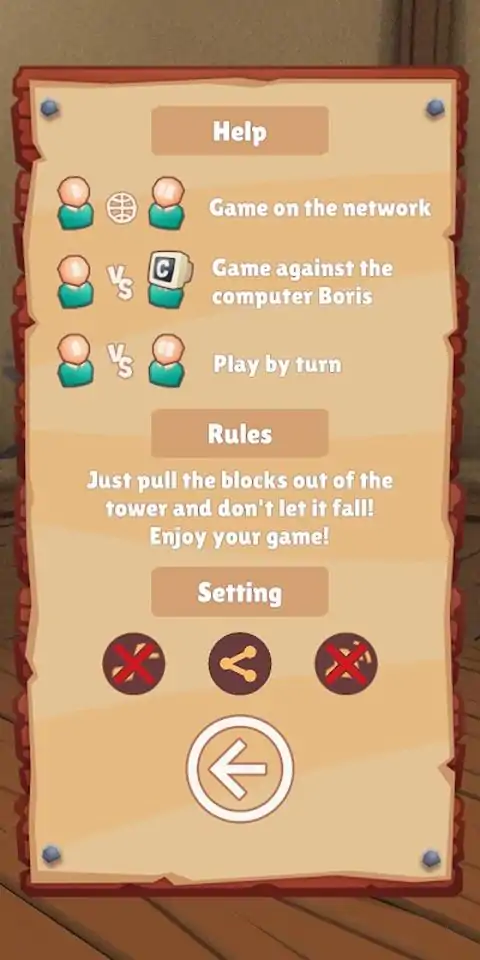 在线与朋友一起玩,或尝试对抗鲍里斯的人工智能。当您与朋友在一起时,您可以轮流在一台设备上玩。 玩起来非常容易 - 将杆从塔中拉出并将其放在顶部,使其不会掉落。 谁推倒了塔,谁就输了。 祝你游戏愉快