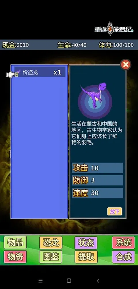 一款轻松休闲的搜集类小游戏,玩家通过不断搜集对应素材合成一只只恐龙来帮助主角变得更加强大以及应对更难的战斗. 总的来说这是一款轻量级的小游戏,纯个人开发,如果您喜欢请支持一下,不喜欢也没必要攻击谩骂.非常感谢. 郑重声明一下,由于个人能力所限,游戏中使用了一些网络资源,如果侵犯了您的正当权益,请联系我.我会尽快替换掉对应资源