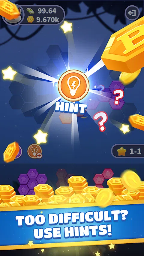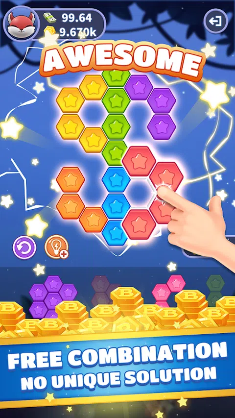 拖动六边形块放置在板上,填满所有空间!我们有数百个关卡等待您挑战。游戏没有时间限制,遇到问题可以使用提示