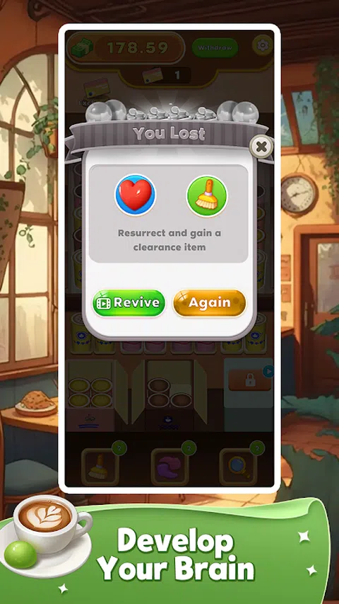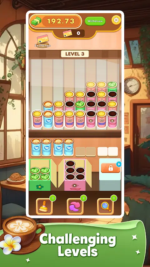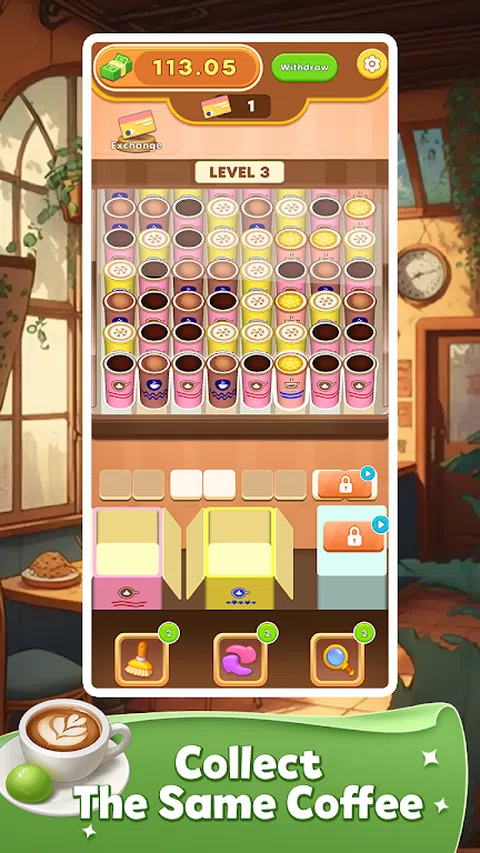 游戏中有排列整齐的咖啡杯,杯子有独特的颜色和图案,代表着不同口味和类型的咖啡。您需要仔细观察这些咖啡杯,然后点击相同的咖啡杯将它们放入相应的盒子中。? 随着游戏的进行,咖啡杯的种类会越来越多,但是空间有限!你必须快速做出决定,合理安排,有效地包装咖啡