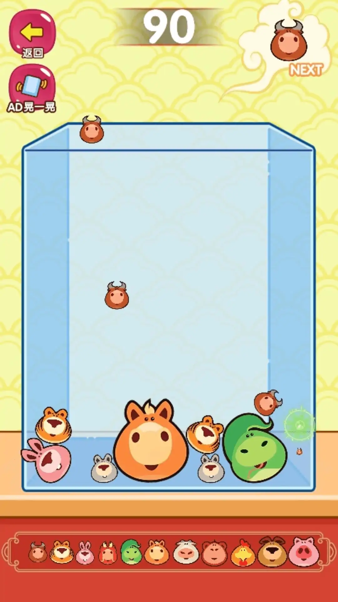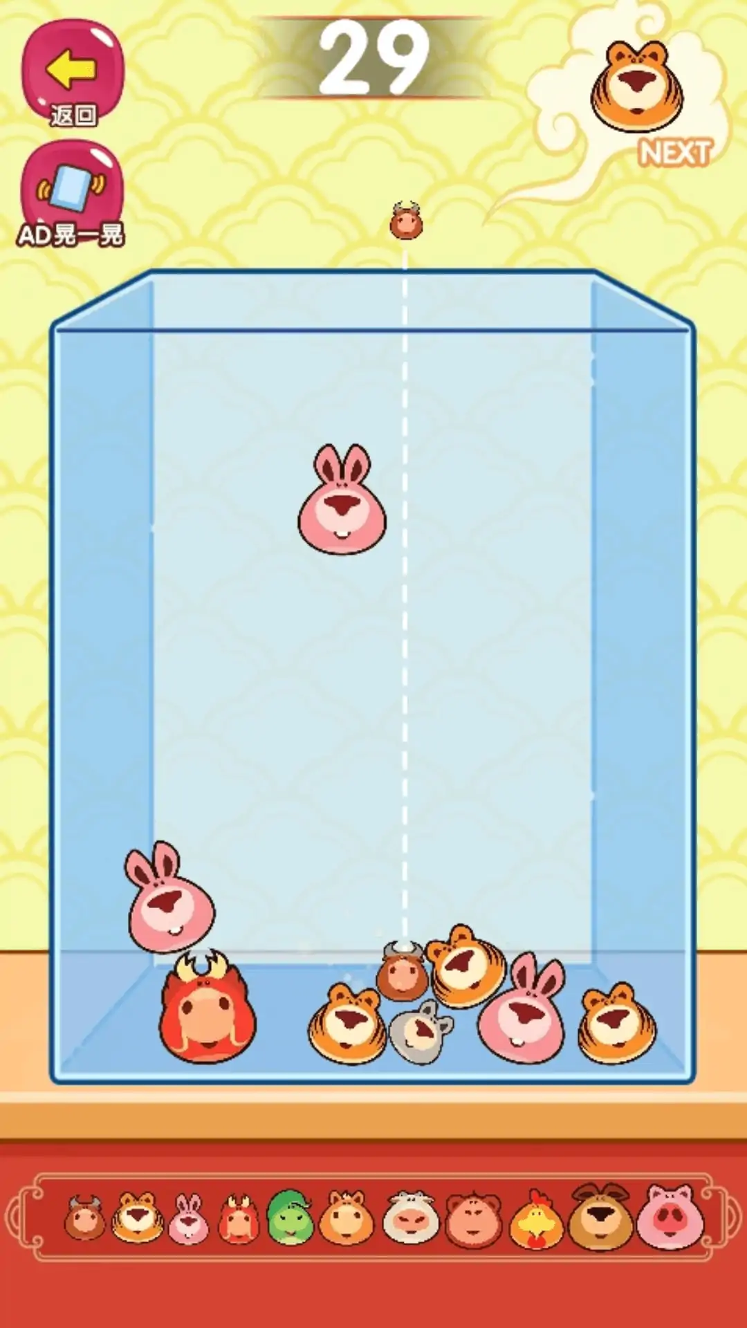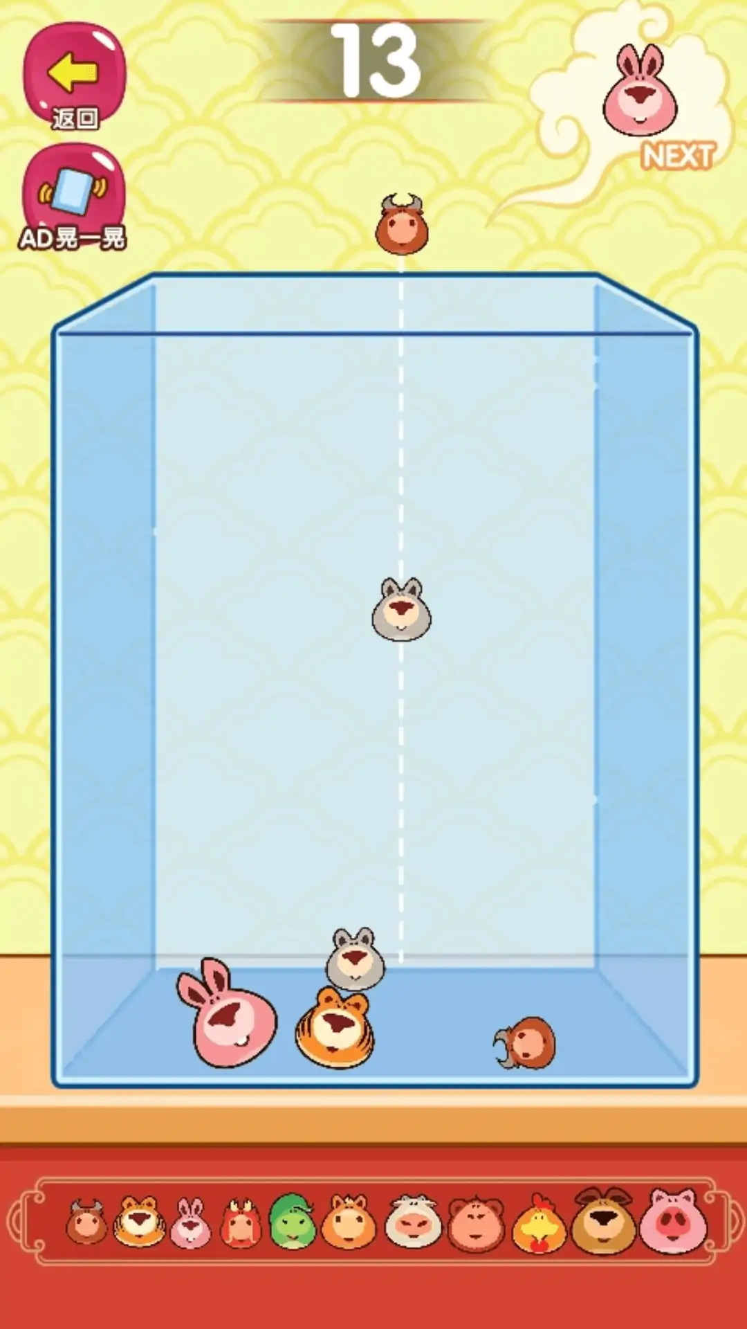 一款休闲类小游戏,游戏的目的是不断的合成更大的生肖!玩家需要选择合适的位置投下随机的生肖,相同的生肖碰撞后会自动合成更大的!玩家需要思考并滑动屏幕,谨慎的选择投下生肖的位置,请注意,整体的高度超过顶部虚线则会游戏结束呦!玩家需要合理安排每一个生肖的位置,利用简单的物理知识,些许的空间感,以及一点点的耐心和运气,才能不断挑战更高的分数。
