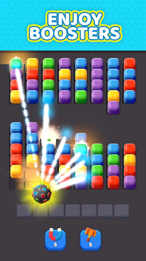 翻转分类:掌握颜色分类的艺术! 欢迎来到翻转排序,这是一款充满活力且引人入胜的益智游戏,您的目标是通过将彩色球匹配成组来对它们进行排序。踏上激动人心的战略规划和快速思考之旅,努力实现关卡目标并避免瓷砖填满。 为什么玩翻转排序? 参与球分类机制:点击以从洞穴槽中选择球,并将它们移动到下面的图块中。匹配三个或更多相同颜色的球,在令人满意的爆炸中清除它们,并朝着您的关卡目标前进。 策略挑战:每个关卡都有针对不同颜色球的特定收集目标。仔细计划您的移动,避免用不匹配的球填满图块,这可能会导致游戏结束。 令人兴奋的助推器:完成更大的比赛以解锁强大的助推器: • 火箭:清除沿途的所有图块。 • 彩虹图块:与任何颜色匹配以收集球。 • 迪斯科球:爆破所有出现的最近收集的颜色。 创新的道具:通过特殊动作增强您的游戏玩法: •撤消:撤回您的最后一步以获得第二次机会。 • 磁铁:拉动并收集三个随机球。 • 锤子:摧毁选定插槽中的球以清除空间。 游戏特色: 直观的控制:通过简单的点击控制轻松上手游戏。将球从一个槽移动到另一个槽,并在下面的图块上有效地对它们进行分类。 多彩的视觉效果:享受充满活力和生动的图形,使分类球在视觉上有吸引力和令人愉快。 关卡设计:每个关卡都提供具有不同目标和配置的独特挑战。某些级别可能包括特殊目标,例如收集特定球类比赛产生的“邮件”或“草”。 游戏流程: 1. 初始级别:首先查看目标和初始球设置。 2. 玩家操作:选择和移动球,使用助推器,并有策略地管理球的位置。 3. 生成新球:使用“发牌”按钮将新球添加到插槽中。 4.完成关卡:达到收集目标即可晋级。 5. 游戏结束:避免用不匹配的球填满图块,以防止游戏结束。 加入分类冒险! 您准备好在激动人心的益智挑战中测试您的球分类技能了吗?立即下载翻转排序,沉浸在充满战略乐趣的多彩世界中。排序、匹配并清除关卡,解锁强大的助推器,成为终极拼图大师! 点击“下载”,立即在翻转排序中开始您的颜色分类冒险