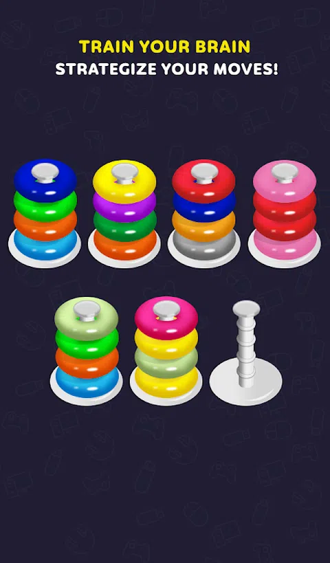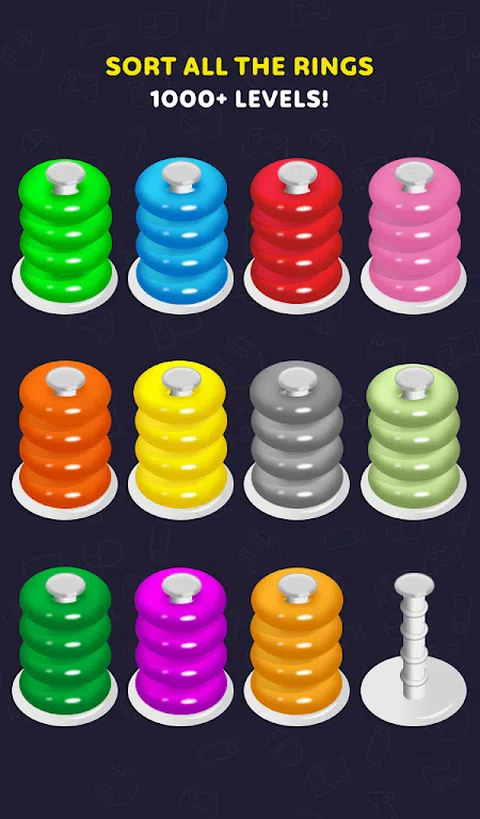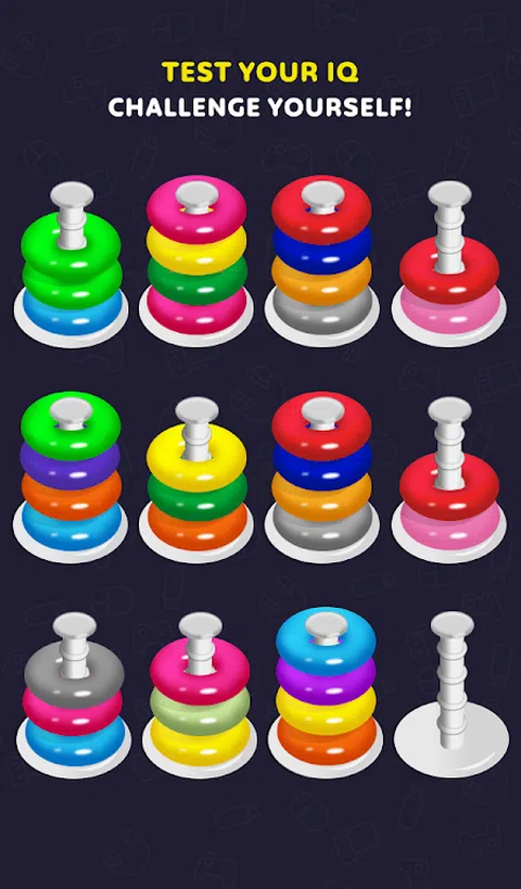 Color Hoop Stack Puzzle –是一款经典的颜色分类和堆叠游戏。通过分类彩色滚铁环解决堆叠难题。这枚戒指游戏具有挑战性,却又轻松益智游戏,会让您迷上数小时。 如何玩这个彩色的铁环堆栈拼图? -在顶部选择一个环形环,并放在顶部或空管中的同色环上。 -当所有环圈在同一堆栈中以相同颜色匹配时,就完成级别了。 -您可以撤消该步骤,也可以使用我们的助推器快速解决难题。 -一次只能移动一个环。 -每个堆叠最多包含4个环圈 特征 -1000+拼图等级 -10多种不同类型的铁环 -4种不同的主题 -助推器–撤消并添加管 -没有时间限制 -简单易用的控件 -容易扮演高手 -提高战略思维能力 此铁环堆叠拼图适用于所有年龄段。我们用大量的思维杂耍水平创建了这个游戏,箍堆栈难题是您想要的一切。开始堆叠彩色的环圈。思考,制定战略并预测每一步