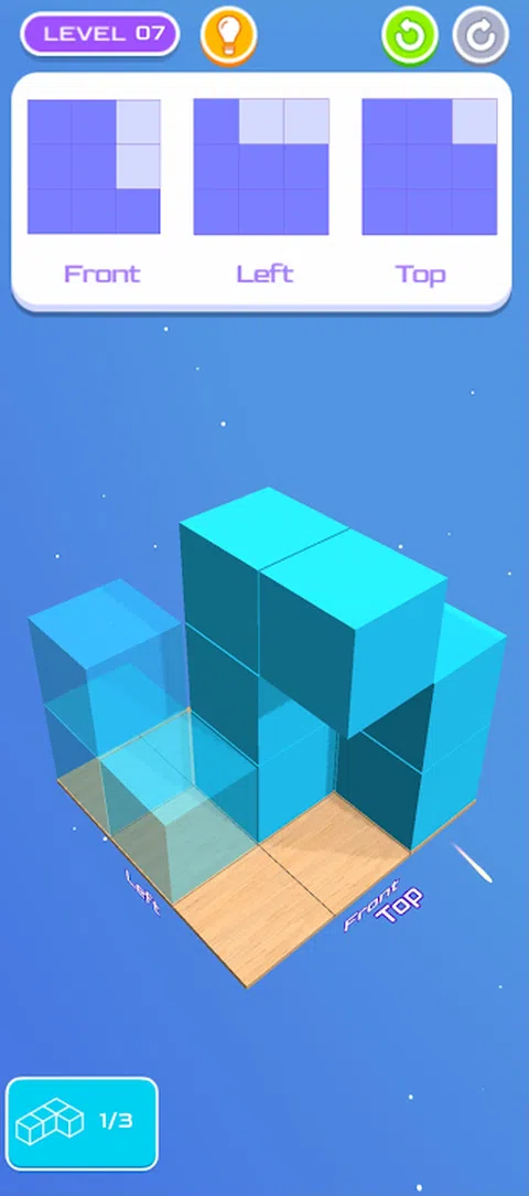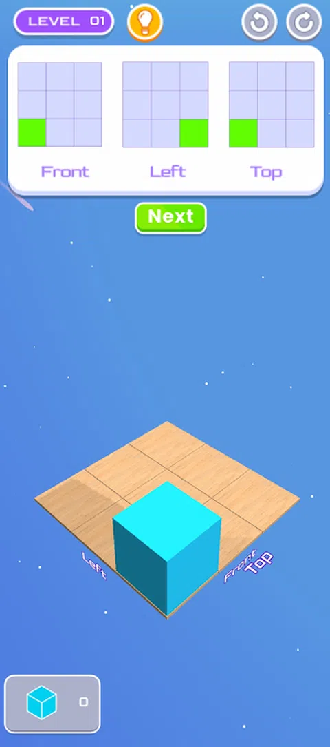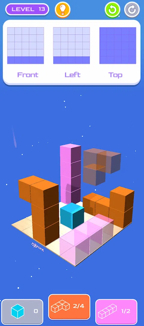 这是一款很棒的原创益智游戏,可以训练您的空间和几何推理能力。玩完这个游戏后,您会发现您可以更快、更准确地在脑海中想象形状和旋转物体。 游戏的目标是使用与左上角给出的 2D 投影相匹配的立方体构建 3D 对象。 所构建的 3D 对象的 2D 投影必须对应于从正面、左侧和顶部观看时各自的参数投影。 您只能使用有限数量的方块,如方块计数所示。有时,您还需要放置形成特定形状的立方体。 必须使用所有建筑材料才能完成关卡。 关卡越来越难,但中间也有简单的关卡,这样你就不会一下子精疲力尽。您可以在高分中与世界各地的其他人比较您的进度