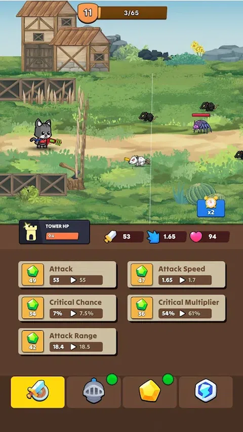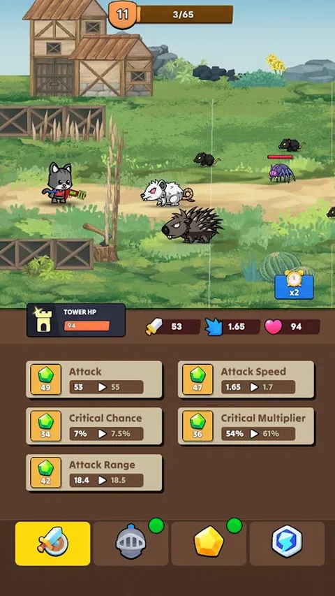 在“猫与老鼠”中踏上史诗般的冒险,这是一款激动人心的防御游戏,您将扮演一只英勇的猫,负责保护您宏伟的宫殿免受成群的可怕老鼠的侵害。作为最后一道防线,你必须运筹帷幄,部署强大的技能,抵御一波波狡猾而无情的敌人。 > 游戏特色 > 简单的点击式战斗。 即使您不玩游戏,也可以享受游戏。 探索各种独特的环境。 面对具有特殊技能的敌人。 建造并强化你的堡垒。 找到装备并强化你的猫。 获得大量每日奖金。 > 游戏方法 < 点击开始按钮开始你的冒险。 看着你的猫自动与老鼠战斗。 点击技能即可发动强大的攻击。 从击败的敌人身上拾取黄金和物品。 使用金币升级能力和装备。 随着您的进步解锁和探索不同的地图。 在每个阶段结束时面对更强大的敌人和老板。 收集每日奖励以提高您的进度。 如果失败,重新开始并变得更强大