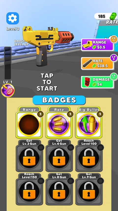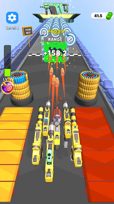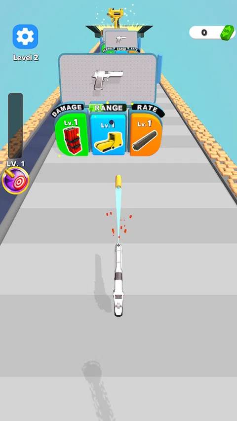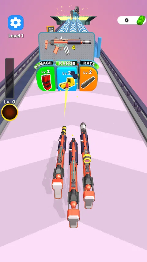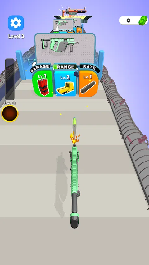 -沿途平台上可以找到武器,平台上有升级这些武器的按钮。要升级武器的速率,请瞄准橙色按钮。要升级伤害,请瞄准绿色按钮。要升级射程,请瞄准蓝色按钮。 -沿途,你会遇到由子弹组成的塔。射击这些塔以收集子弹,这些子弹将进入屏幕左上角的栏。当条形填满时,其下方的技能卡也会进步。一旦卡片完全升级,它将为您带来额外的伤害和特殊能力。 -到达终点线以发现新武器