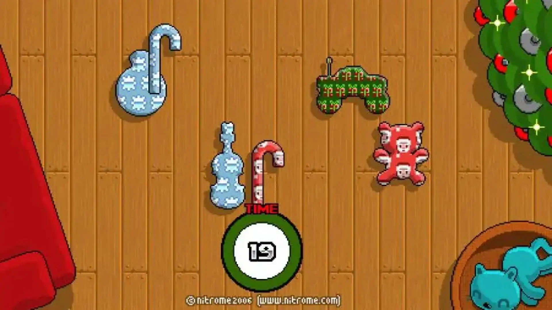 Nitrome在2006年12月1日发布的一款游戏,玩家需要在限时内找到尽可能多的指定礼物。游戏开始时限时20秒,每找到一件指定礼物奖励5秒时间。这是Nitrome发布的第八款游戏,同时也是Nitrome的第一款迷你游戏。