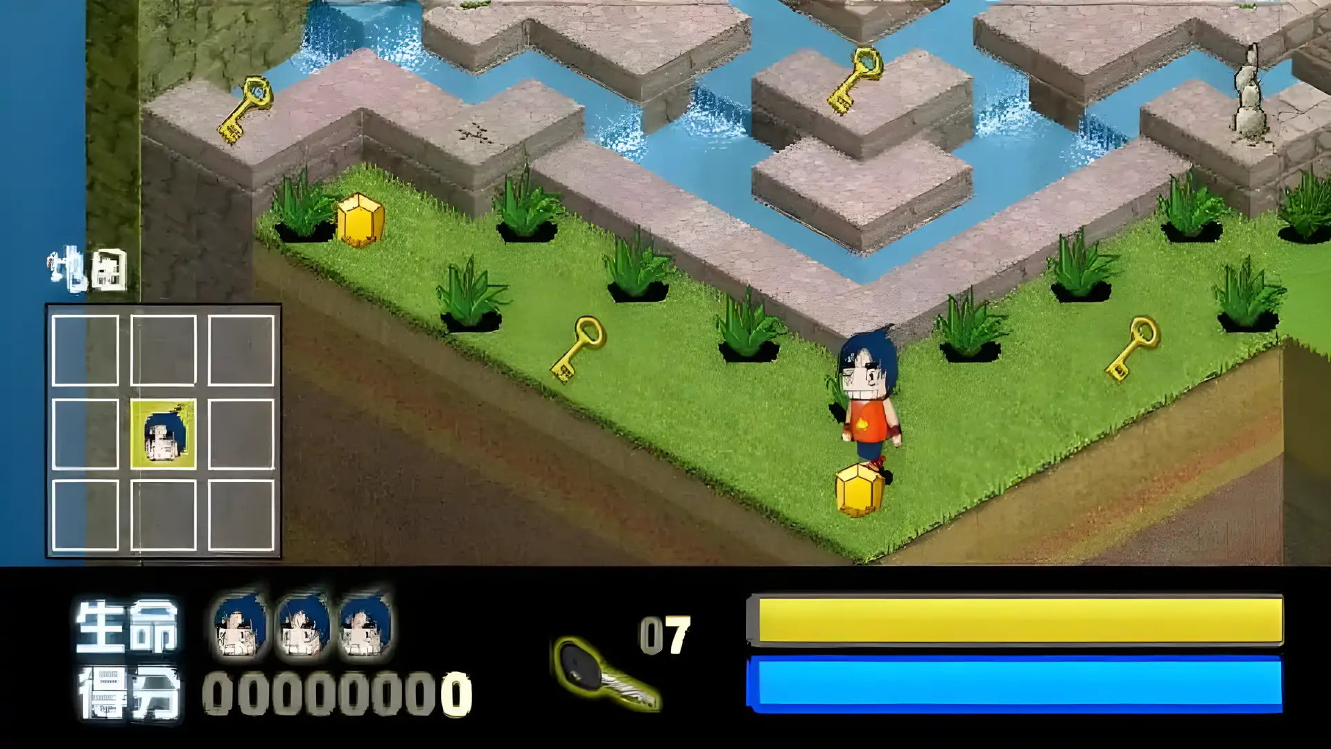 早期破解汉化的一个冒险游戏,游戏目的是在关卡中收藏钻石和其他宝藏,同时远离食人鱼感染的水域和其他凶残的生物。 在关卡中获得所有钥匙后出口才会被打开,同时尽可能多的获得拾取关卡内的宝石吧,用来提升过关分数。 每一关的地形都非常险恶,加上2.5D地图展现方式,有时很容易就按错方向键,所以请各位操作时一定要小心。