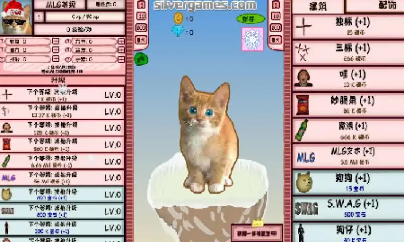 宠物题材的放置点击游戏,点击小猫赚取金币,可以来升级各种能力,页可以为你可爱的小猫购买新的配件,一副太阳镜或一顶漂亮的帽子。努力赚取金币,将您的建筑物进行升级吧。注意,这个游戏很容易上瘾。