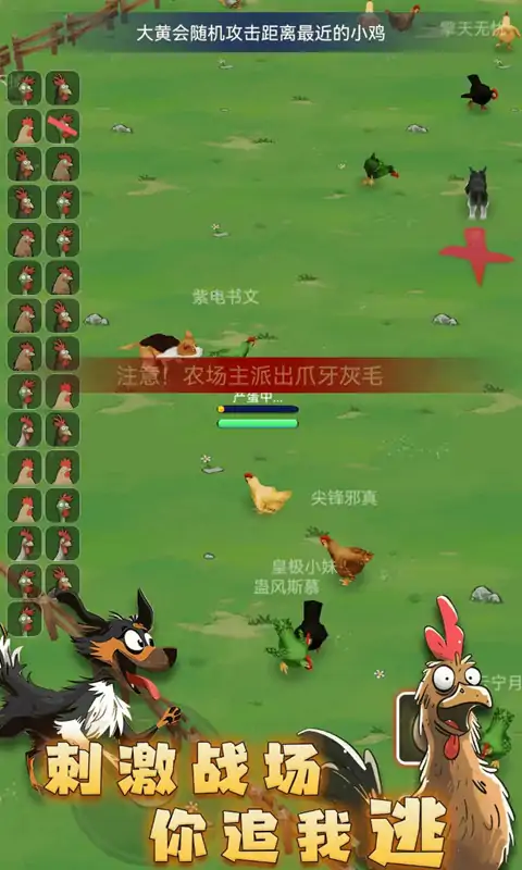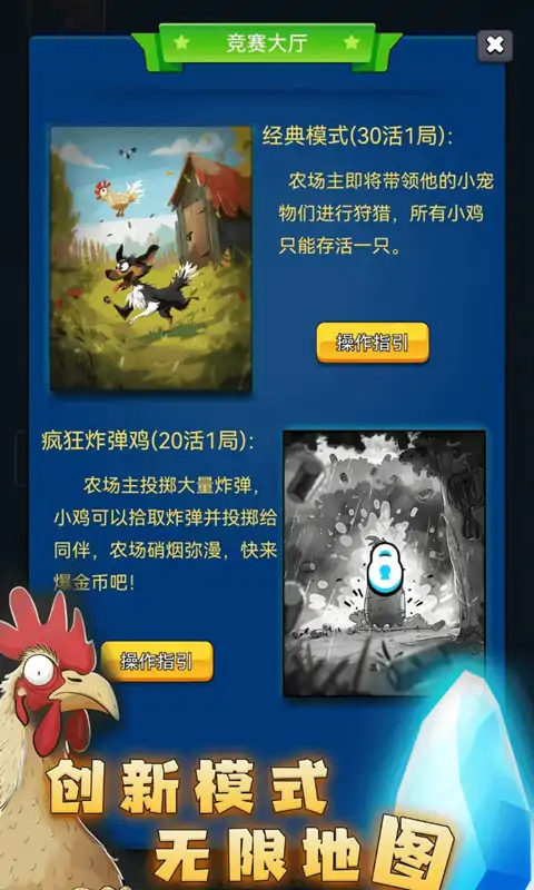《最后幸存鸡》是一款以小鸡仔为萌物主角的竞技对抗休闲游戏,鸡仔们不仅是与农场主一方的恶势力作斗争,彼此之间也有各种爆笑有趣的对抗模式。游戏中存在一定强度的竞技对抗,作为一只小鸡仔,如果摆脱不了自身宿命,那么最后的结局只能成为农场主的盘中餐,欢迎各位玩家来解锁一只鸡的各种烹饪方式。