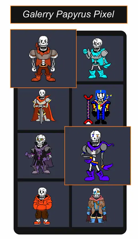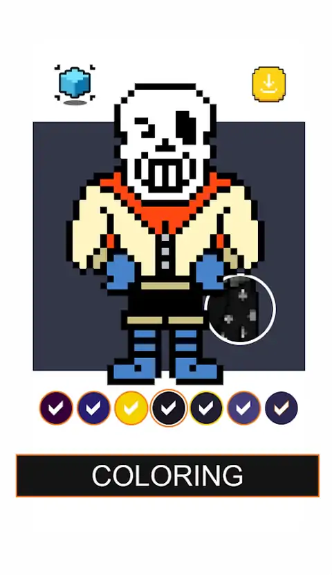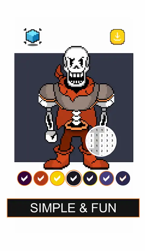 Papyrus Undertale Pixel是一款免费的绘画和绘图应用程序,适用于所有Papyrus Undertale粉丝,它非常易于绘制像素艺术,既简单又有趣,概念很简单,只需按颜色键即可完成图片。发现大量的纸莎草像素。纸莎草纸传说中的像素艺术着色也是创造最具想象力的艺术的理想画布。如何用两根手指播放纸莎草纸像素艺术捏捏来放大或缩小画布。选择底部的颜色,然后按数字选择颜色。长按可连续绘制相同编号的单元格,从而使绘制更快,更容易。保存绘画和视频,并与家人和朋友分享