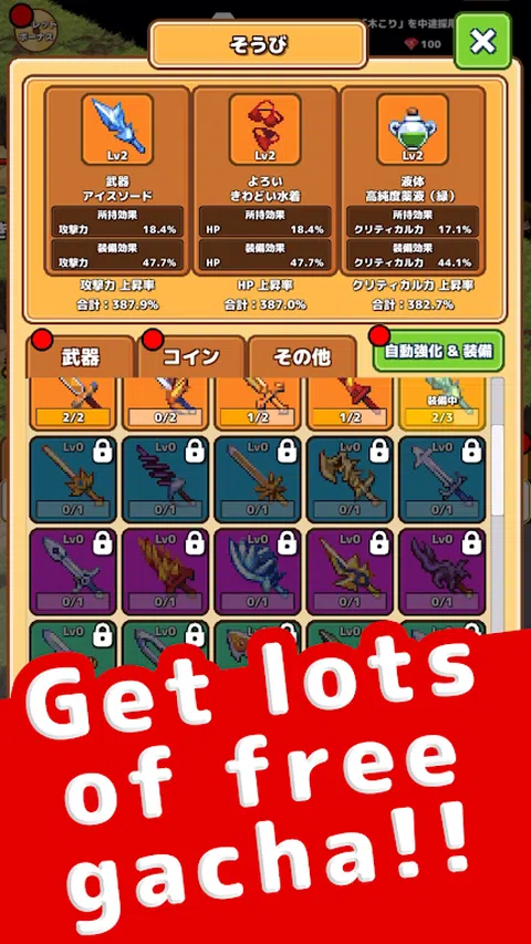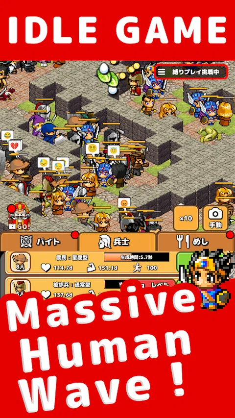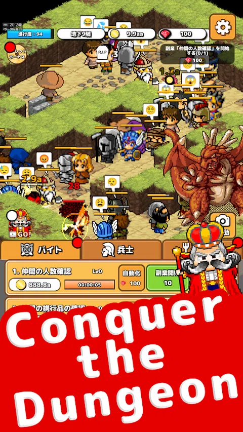 被辞退英雄职务的勇者,成为地下城突击队的队长! 用压倒性的商品征服地下城,打倒地下 99 层的魔王! 新型 RPG“一起攻城并不可怕”登场! 在由点组成的复古奇幻 RPG 世界中,您可以在这个免费的离开房间 RPG 游戏中与压倒性的朋友一起攻击地下城,这违背了 RPG 的常识! 量产型 虽然属性较低,单独行动时也很弱,但它们可以在短时间内大量出动,以绝对的质量压倒怪物。他们擅长通过击败其他玩家无法击败的怪物来支持其他玩家。 在攻城的同时,屏幕上会播放生活在幻想 RPG 世界中的朋友的真实推文,因此您可以作为攻城团队的经理体验身临其境的角色扮演体验。 当您玩游戏时,您可能会发现自己在聆听朋友的真实推文。 多种具有挑战性的强化要素 每个玩家的力量和攻击能力随着他或她同伴等级的提高而增加。 使用击杀怪物获得的材料提升测试者的等级,将强化测试者对应的同伴类型。 通过提高可以轻松收集强化所需硬币的兼职工作的等级,获得的硬币数量会增加。 9 件装备都有各自的能力修正,通过收集高稀有度、高等级的强力装备,可以提升相应的能力。 通过转职来提高永久有效物品的等级,将使地下城的攻击变得越来越容易。 由玩家决定强化哪些物品。这是流行的通货膨胀角色扮演游戏系列中的一个具有挑战性的游戏,在游戏中,您的同伴通过强化他们而迅速变得强大! 此外,还可以记录打倒的怪物完成怪物书,进阶到特定关卡,挑战任务获得特定物品! 这是一款无需操作的点击游戏,玩家只需点击屏幕即可征服地下城的每个关卡;无需复杂的操作,只需点击即可强化并指点各种魅力十足的好友,如战士、巫师、武术家等,这些都是 RPG 中的标配。 由于游戏是一种放弃式游戏,即使您不玩游戏也会继续进行,因此您可以在不玩游戏时收集物品并让您的朋友变得更强大。 如果您在征服地下城时遇到困难,您可以通过离开游戏一次然后再玩一次来解决问题! 这是流行的“别管它”类型的点击游戏,可以在很短的时间内享受,使其成为您在业余时间消磨时间的完美游戏。游戏免费且易于上手。 自动战斗是这款点击游戏的特色。玩家招募的同伴会自动出去探索地下城。当您的朋友击败地下城每一层的 BOSS 怪物并找到通往下一层的楼梯时,他们会自动前进到下一层继续探索,因此您基本上可以不玩游戏。 游戏上手简单却有深度的玩法,每层成功的关键在于像塔防一样的训练和点击加速的策略顺序。 如果你想开始一个新游戏来消磨时间,或者如果你只是想点击屏幕玩游戏,或者如果你喜欢角色扮演游戏、点击游戏、充气游戏或幻想世界中的角色扮演游戏,这是一款免费的充气游戏,具有很多挑战性元素!如果您喜欢地牢游戏、点击游戏、加速变强的通货膨胀游戏或奇幻世界中的角色扮演游戏,您一定会喜欢这款充满挑战的免费通货膨胀游戏