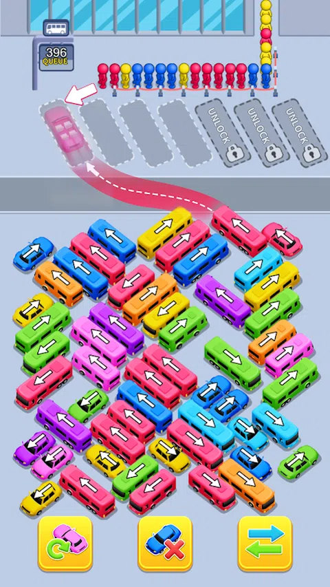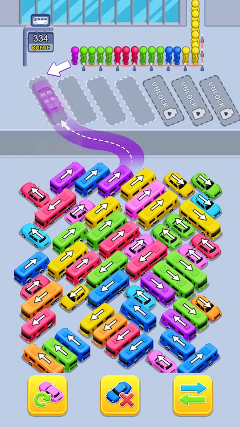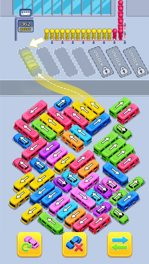 乘客正在等待自己的巴士,根据颜色将他们分配到巴士上,然后将他们送上车