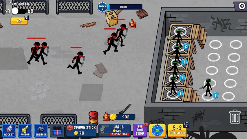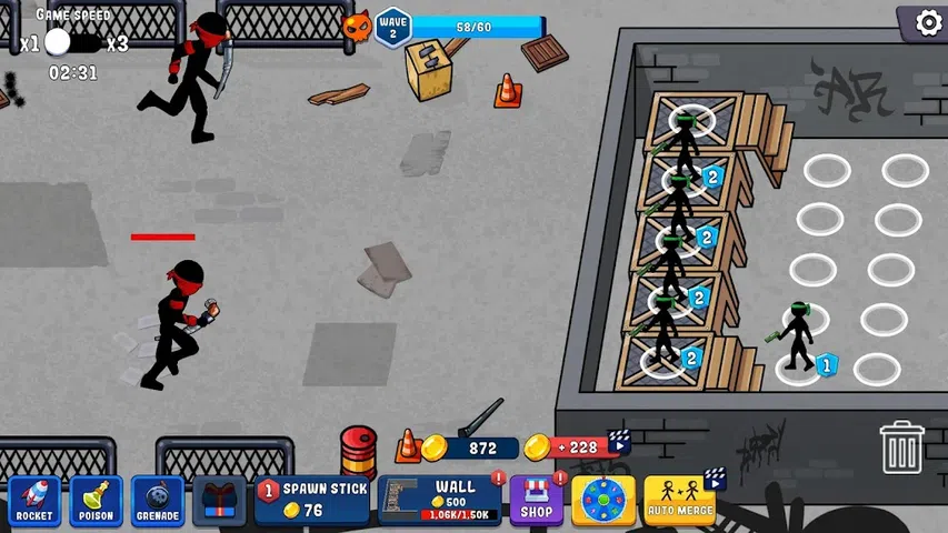 火柴人守卫者:火柴人战争是一款动作+基础防御+合并游戏。守住防御,粉碎敌人的火柴人,为你的火柴人加油。很多武器。近战和远程战斗。创建自己的超级火柴人。保卫你的基地,抵御邪恶的火柴人。 将你的火柴人组合成更强大的小队,保卫你的基地。敌人的火柴人没有睡觉,敌人的小队正在等待你的弱点来摧毁你的防御。史诗般的战斗不会让你放松。您将受到近战和远程火柴人小队的攻击。改进墙壁,升级你的战斗机,使用辅助战斗选项:火箭、手榴弹、毒气攻击。 在不同的地点战斗。收集各种武器:从简单的手枪到未来的武器。 别忘了试试你的运气 - 幸运之轮会给你带来很多奖金。 特点: 合并火柴人以获得强大的防御。 准备好与强大的老板战斗