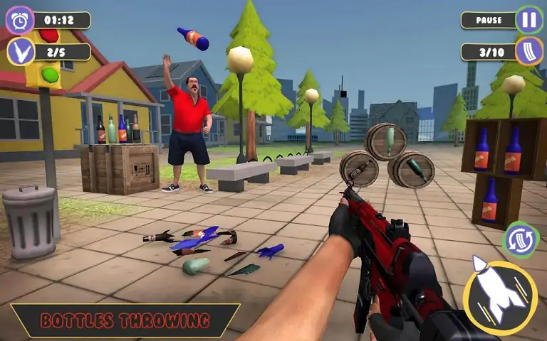 一个穿着红色衬衫的男人把瓶子扔了起来,球员需要在瓶子撞上地面之前将其射击。以及它的多种类型的翻转和射击等级。控制您的枪支并击落所有翻转的瓶子,成为Bottle Flip Shooting Challenge 3D游戏中的终极射击大师。随着过程的进行,障碍物变得越来越重,物体旋转,飞行,飞速移动。如果是布娃娃目标,请得分最高,并尽量不要击中您的好友。在排行榜上获得最高分,赢得金牌。这款独特的射击游戏具有30个级别,包括独特的目标,10个枪支升级和环境主题,一定会让您沉迷数小时。逼真的3D射击路线,目标和大型枪械升级难度各异。解锁真棒武器,并随着武器库的发展升级它们。独特,具有挑战性和令人上瘾的关卡设计,具有很高的重放能力。您准备好在这款超赞的fps射击游戏中进行所有动作和冒险了吗?立即行动起来,享受这款顶级射击游戏中的冒险!遵循训练规则并采取行动!扮演射手和破坏者的角色,创造精彩的投篮机会,挑战自己和朋友,并提高自己的得分。让我们看看谁将是最好的射击大师。游戏特色:-经典射击游戏-狙击枪,步枪,手枪等的真实3D射击体验-移动,旋转和翻转瓶子以增加难度-距离射击者距离可变的瓶子-超逼真的射手声音-引人入胜的图形效果-平滑的微尖喷枪控制-各种主题,例如森林,航道,城市,白天,黑夜和多雨