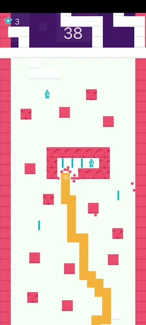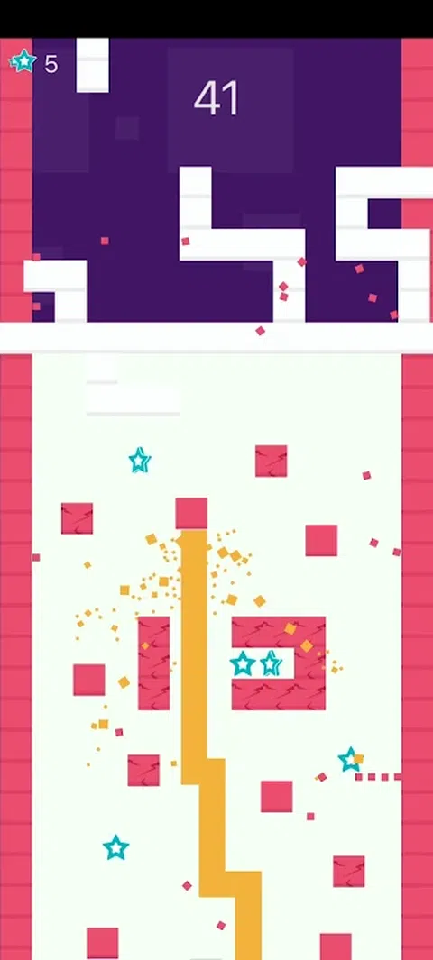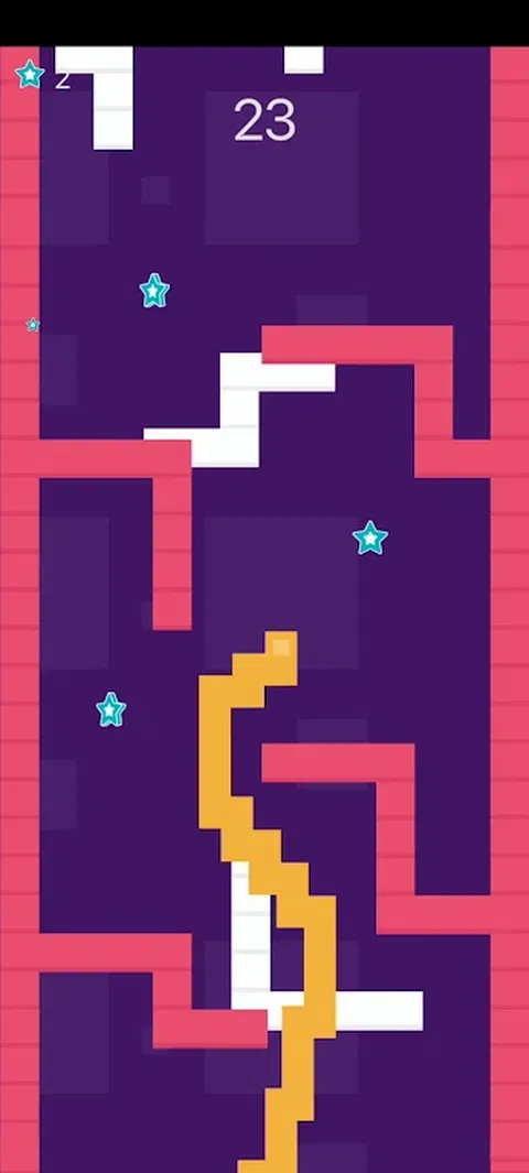 在这个游戏中,通过点击屏幕左右两侧来旋转像素线来做出决定,以避免撞到障碍物。在此过程中,您需要收集尽可能多的五角星。这可以让你兑换更多的像素皮肤