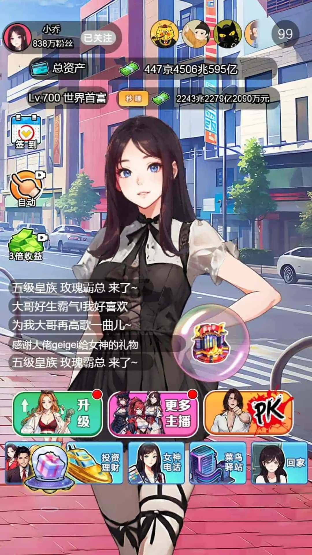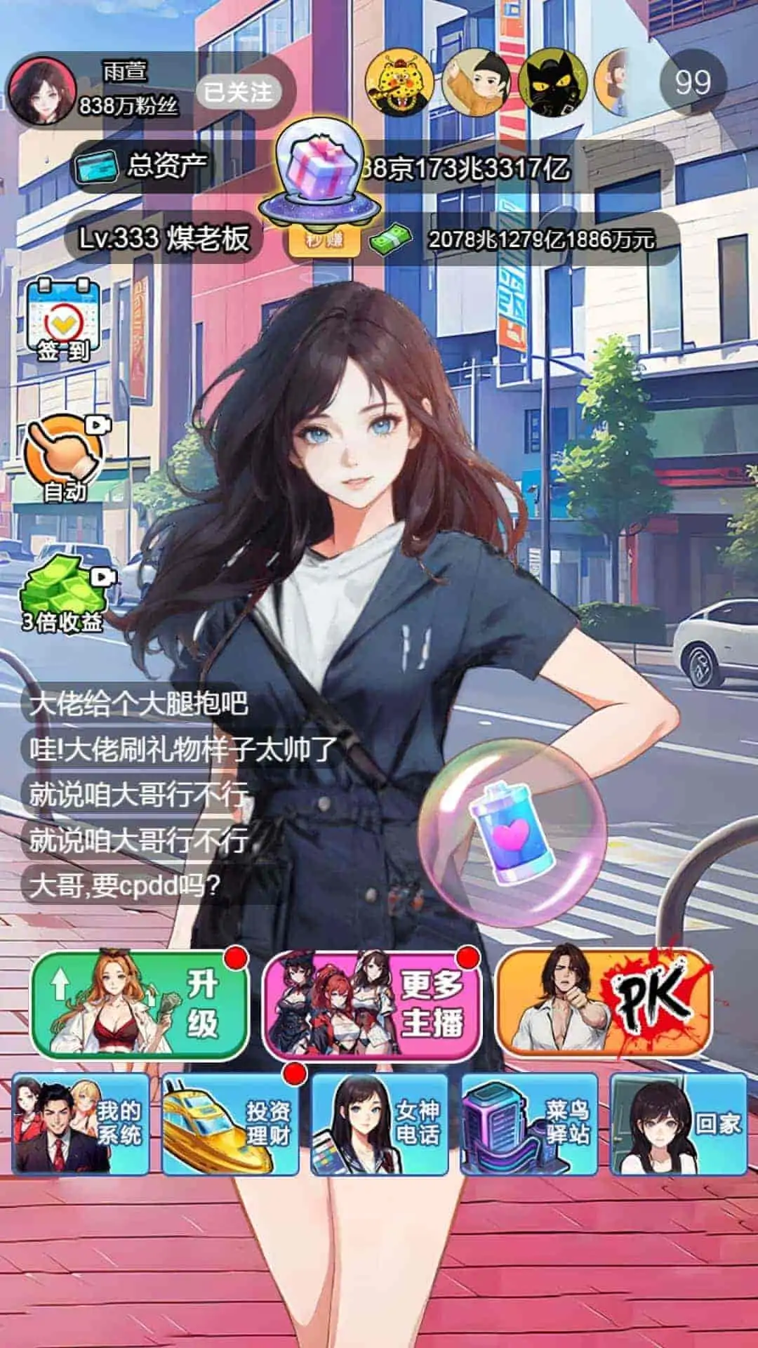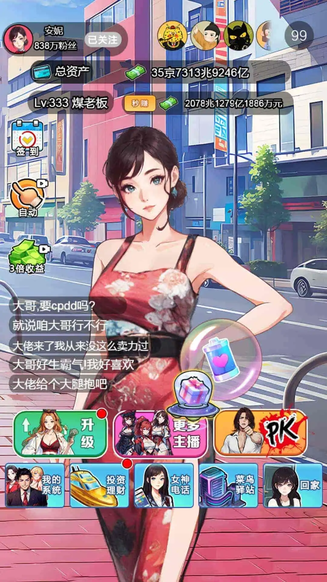 这是一款2D休闲养成类游戏,在游戏中玩家需要扮演一名平民,通过救助了一个女主播开始,一步步地给女主播刷礼物并且同步进行招聘女主播进行变现,提升自身资产价值,进而成为商界大佬和世界首富,该游戏还有更多好玩有趣的挑战哦,让我们一起来体验一下吧!