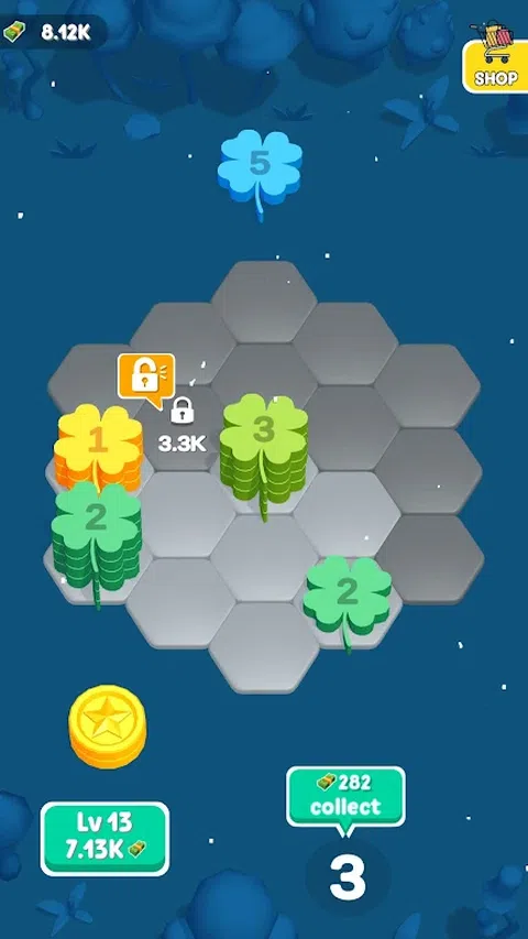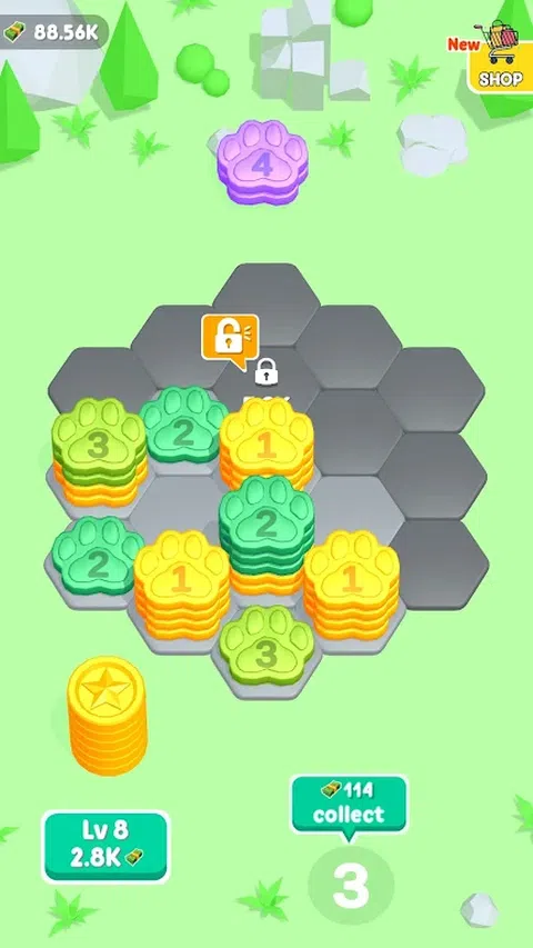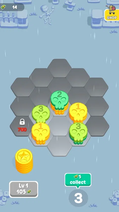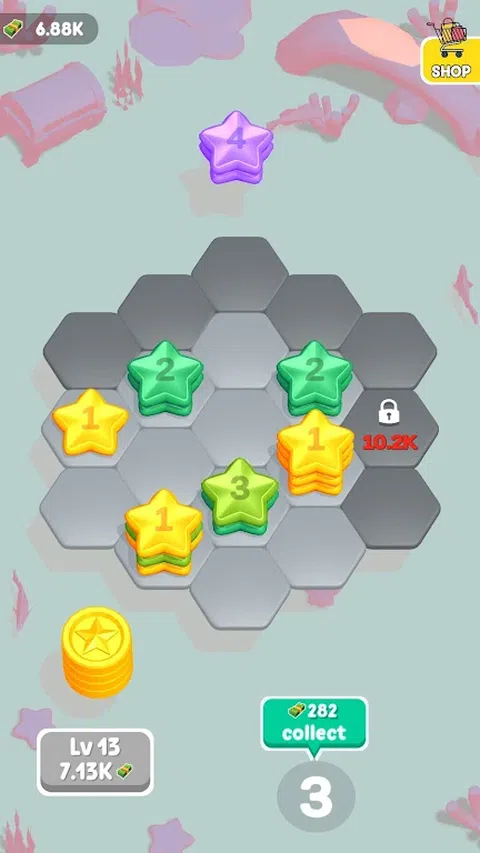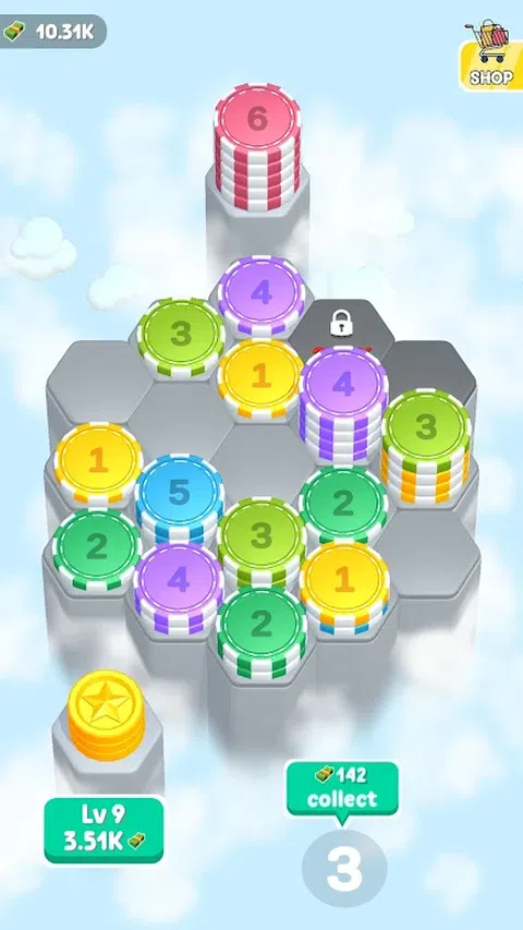 欢迎来到我们的超休闲益智游戏,您可以在六边形网格上合并硬币,堆叠数字并收获奖励。组合硬币以创造更高的数字并产生利润。制定战略以防止陷入僵局,并不断合并以取得成功。注意网格是否饱满;如果您无法再合并硬币,则游戏结束。在这个令人上瘾的硬币合并冒险中测试您的合并技能和放松