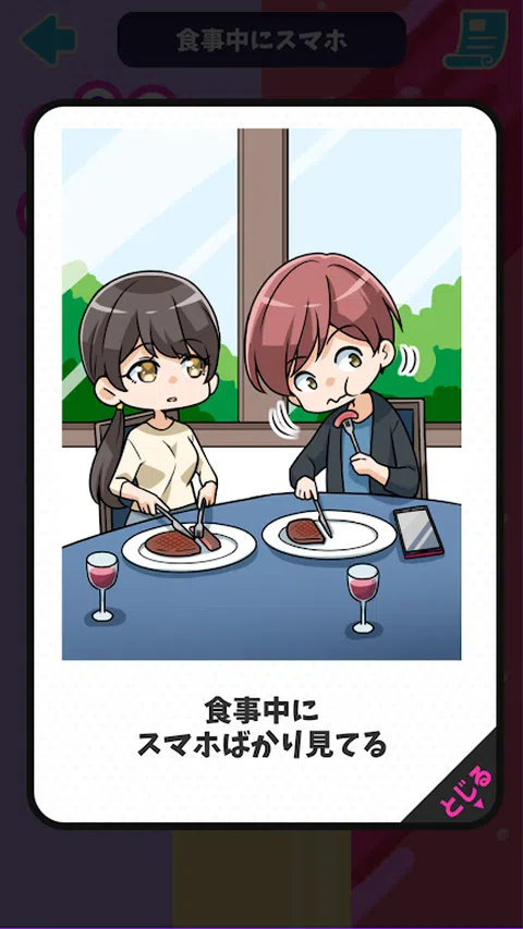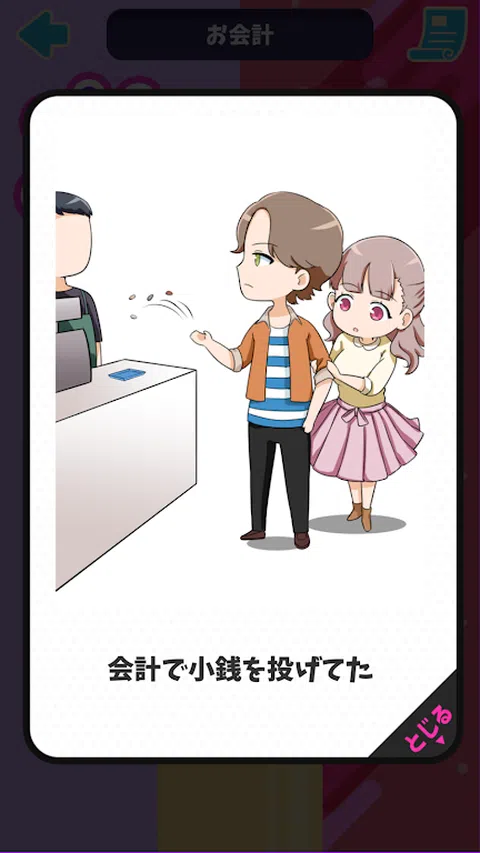 一款以“青蛙变身”为主题的新型休闲游戏! 通过简单的滑动操作,体验各种青蛙变身故事,决定是否要成为青蛙! ▼青蛙变身情节示例 ・账单被分割到最接近的1日元。 - 对店员的专横态度 ・拥抱你的时候我的头很臭 ・拿筷子的方式不正确 ・吃饭时一直看智能手机 青蛙变身剧集有100多种! 请边欣赏青蛙变身故事,边感受“哦,这真是太真实了!” ▼游戏特色 ・充满真实体验的青蛙变身场景! ・观察青蛙的变形现象并选择如何反应! ・享受各种各样的青蛙变形现象和后续故事! - 只需向左或向右滑动角色即可!非常适合通勤或有一点空闲时间时! 如果您玩得开心,我们也很乐意看到您现场直播游戏