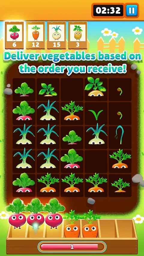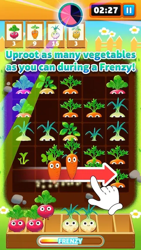 拉!拉!拔出那些蔬菜! 滑动以拉出蔬菜并收集三个相同的蔬菜! 新鲜的三消游戏就在这里! ■向上滑动以收获! 蔬菜从田间发芽开始,逐渐长大! 向上滑动成熟的蔬菜以收获它们! ■ 根据您收到的订单交付蔬菜! 收获三个相同种类的蔬菜来运送它们! 根据订单投递蔬菜的种类和数量即可过关! ■ 在疯狂中尽可能多地连根拔起蔬菜! 连续送出一定数量的蔬菜后,就会开始疯狂! 蔬菜在疯狂期间生长得更快,从而可以更快地交付