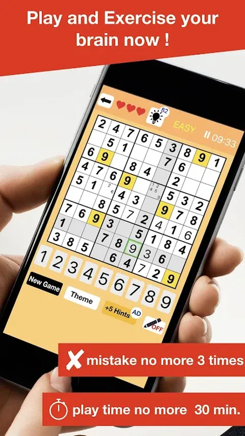 数独游戏 - 逻辑大脑锻炼是逻辑拼图提高和锻炼你的大脑! 数独游戏 - 逻辑大脑锻炼有包括2种类型的数独游戏与 1.经典的数独 2.颜色数独 简单的规则:玩家必须通过1号填解决 - 9竖列,横向排列,3x3的区域,每个区域3种模式输入。 在空单元格的是,玩家必须解决和1-9之间分析概率的逻辑问题。 玩家越玩乐趣与功能特性,为您提供游戏更容易发挥 有提示,自动检查,做笔记,高亮和重复亮点。 特征 这个程序有你可以通过无休止的永远玩到一个新的水平,这样就可以天天打,每一次无尽的水平。 - 当您遇到问题,使用提示! - 统计信息页,让您的最佳时间,赢得时间,挑战你做出更好的时间。 - 获取完成后1个暗示了比赛。 - 更改颜色主题功能,请为你放松眼睛。 怎么玩 1.选择你喜欢的(简单,中等,硬或专家)任何困难的水平。 2.选择数独玩(经典的数字或颜色数独)的类型。 3.选择空单元格作出选择。 4.点击数(1-9)或颜色中选定的单元格填充。 再次5.点击相同数量或相同的颜色,以取消填充或利用其他数(或其它颜色)来填充。 当你想这个细胞透露一丝然后点击提示按钮6.点击空单元格作出选择。 7.当你输入错误的号码,他们会告诉我们,在红色的数字!在经典号数独。 8.当你输入颜色不对,他们会通过颜色数独[!]信告诉我们。 9.点击铅笔按钮切换开/关在细胞做笔记 9.完成比赛结束后,你可以玩新游戏或开发新的游戏按钮,获取新的游戏或重置游戏。 10.错误填不容许超过3次。而扮演游戏不允许超过30分钟。 数独游戏 - 逻辑大脑锻炼是最喜欢的游戏,对改善大脑的逻辑分析的发挥,即使时间杀打。 通过选择更困难的水平变得越来越困难的问题! 你能正确回答所有问题吗? 让我们一起来欣赏和NOW提高你的大脑