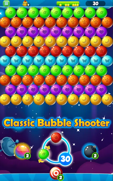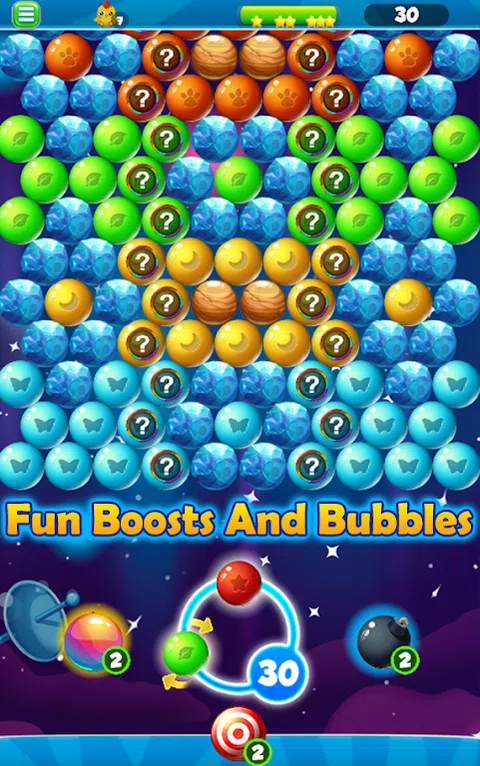 Bubble Pop 是一款很棒的全新泡泡射击游戏 900 个令人惊叹的关卡 。 在《Bubble Pop》中,您将拥有许多关卡和独特的功能,使其比其他泡泡射击游戏更好, 在《Bubble Pop》中,你不只是爆破泡泡并完成关卡,这里有非常特殊的关卡设计和独特的球机制,可以让你玩很长时间。 泡泡射击游戏有许多独特的关卡,让您长时间玩下去, 每个级别都经过专门设计,既有趣又具有策略性,并且比以前更好, 在每个关卡中,你都必须弄清楚泡泡拼图以及如何弹出所有的球。 Bubble Pop 类似于老式经典和街机泡泡射击游戏,向匹配颜色的泡泡射击,并匹配至少 3 个相同颜色的泡泡 为了让它们破裂,你破裂的每个气泡都会为你的助推器充电,然后你可以在任何你选择的地方爆炸,以清除水平并摆脱 难以到达的地方,只需点击屏幕即可发射气泡,点击并按住即可查看目标方向。 请记住,您可以从屏幕一侧弹起球并击中直线无法击中的气泡。 超级球 - 打破一切阻碍。 炸弹球 - 当它击中其他气泡时爆炸并爆炸。 超级瞄准 - 使瞄准点更长、更精确,以清楚地向您显示球将击中的位置。 Bubble Pop 专门设计了独特的泡泡球来弹出,例如: 尖刺球 - 弹出并爆破它接触到的所有物体,并且不会匹配 3 个泡泡。 冰球 - 弹出它旁边的球,它会转换成它们的颜色。 问题球 - 每次您射击泡泡时,问题球的颜色都会改变。 云彩球 - 将至少 3 个与旁边的云彩球颜色相同的颜色配对,使其弹出。 木球 - 你必须爆破它周围的所有气泡才能使其掉落,这个球无法匹配。 还有很多!