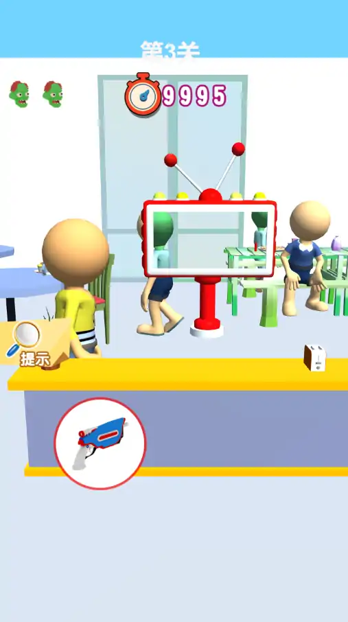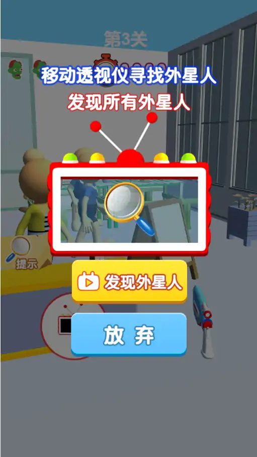 这是一款以找到伪装的外星人为目标的3D休闲闯关游戏,你作为星球的守护者需要穿梭在各种住宅、郊区、农场中,以绝佳的观察力和你的扫描仪将伪装中的外星人找出来,在消灭外星人的过程中注意不要伤到无辜的居民,并抓准时机使用你的电磁枪消灭外星人,防止外星人侵占你的星球。