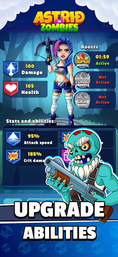 在这个激动人心的动感十足的游戏中,与手持强大弩的无畏女孩阿斯特丽德一起踏上史诗般的旅程!阿斯特丽德需要你的帮助来完成关卡,击败有趣的僵尸,并收集闪亮的硬币。使用您的超级瞄准技能射击僵尸,看着它们在您的技能之前倒下! 但这还不是全部 - 空气中有魔法!阿斯特丽德可以做很酷的神奇事情来解决难题并发现秘密。你猜怎么着?你可以通过提高阿斯特丽德的技能和解锁特殊力量,让她变得更加神奇! 在游戏时,收集大量硬币,因为您可以用它们来拯救最可爱的小宠物。这些毛茸茸的朋友将加入阿斯特丽德的冒险并帮助她。每个宠物都有一些特别的东西,使游戏更加精彩