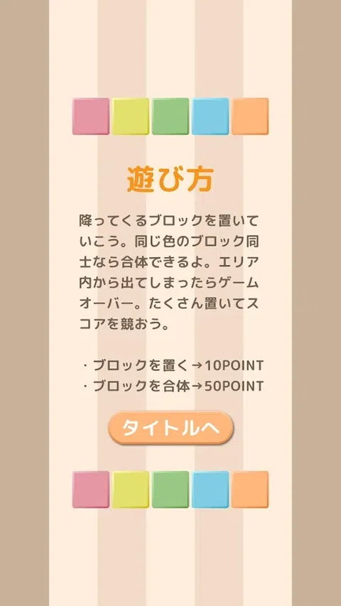 “Genkidama!基于 SDG 的治疗游戏项目”为患有发育障碍(自闭症、阿斯伯格综合症、注意力缺陷/多动障碍(ADHD)、学习障碍和抽动障碍)的儿童开发治疗和教育游戏应用程序。 这是一款专为残疾儿童设计的简单游戏应用程序。 ◆《UNION Color Puzzle》规则超简单◆ 一个简单的游戏,您可以通过组合相同颜色的块来争夺分数! 游戏的流程是,当你开始玩时,你将从上方落下的方块移动到左右来消除它们。 如果下落的方块颜色相同,它们可以与接触的右、下、左方块组合。 如果您将一个方块放置在 7x5 的正方形中,您将获得 10 分。 通过组合相同的颜色可以获得 50 分。 如果您走出 7x5 方格,您获得的分数将在游戏结束时显示。 有两个难度级别可供选择:“普通”和“困难”。“困难”更难,因为方块比正常下落得更快。 通过填充和组合适合您的难度级别的块来获得最佳分数