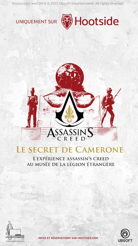Assassin's Creed - Camerone's Secret 是一款身临其境的增强现实手机游戏,可通过您的智能手机获得。去欧巴涅的外国军团博物馆体验一下。 体验是在室内使用您的智能手机进行的,可在外国军团博物馆的开放时间内访问(时间在说明底部)。游戏路径发生在集合中,并提供增强现实中的交互。 1863 年在墨西哥,传奇的卡梅罗内战役将外国军团与数千名墨西哥士兵对抗。幸存的军团士兵会带回一件神秘而强大的神器,隐藏在外籍军团博物馆某处的欧巴涅。 使用您的智能手机和增强现实技术,浏览博物馆寻找线索,并深入了解这场战斗英雄的记忆,以找到文物并保护它。 行动不便人士和耳聋或听力障碍人士可使用的路线。 建议无伴奏的年龄:14 岁。 外国军团博物馆: 周二至周日上午 10:00 至下午 12:00 和下午 2:00 至下午 6:00 开放。 更多信息请访问博物馆网站
