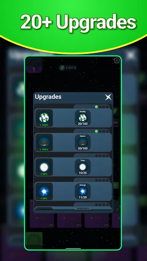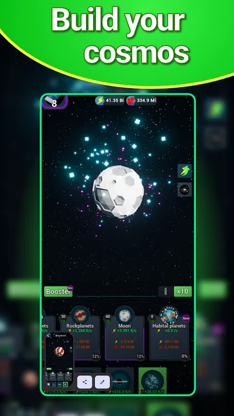 空闲宇宙是一款空闲增量点击游戏,基于科幻空间环境中的轻松空闲游戏玩法。 您从只有空白的空间开始,然后逐步扩展到巨大的星系等等! ★ 开发拥有100多种元素的Cosmos ★ 使用威望来提高您的整体产量 ★ 在技能树中花费技能点数 ★ 即使您不在,也可以享受您的进步 - 酷炫的闲置游戏 ★ 奖金和特权 ★ 无需网络连接,完全离线游戏 ★ 进化你的宇宙,让你的宇宙更大 喜欢玩这款闲置点击游戏 那么你能建造银河系吗? 如果您有任何问题,想分享一些创新的想法,请随时给我写信