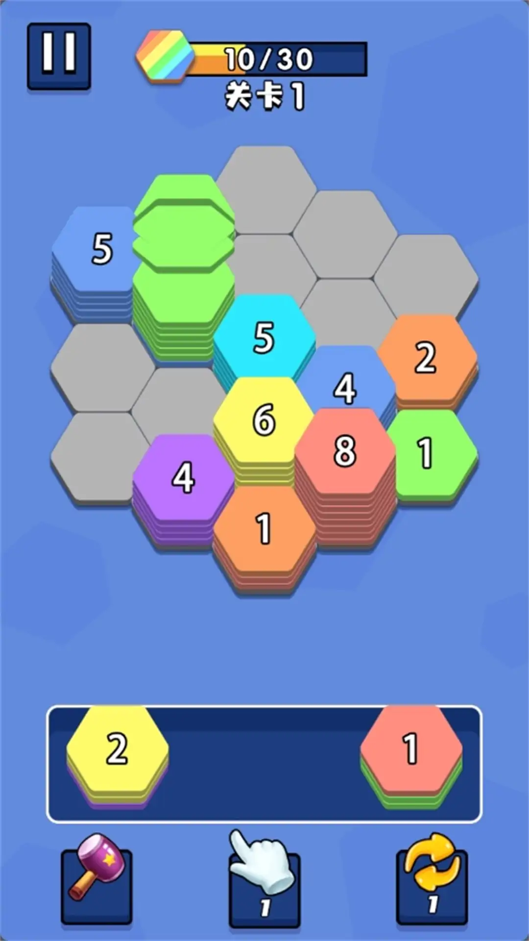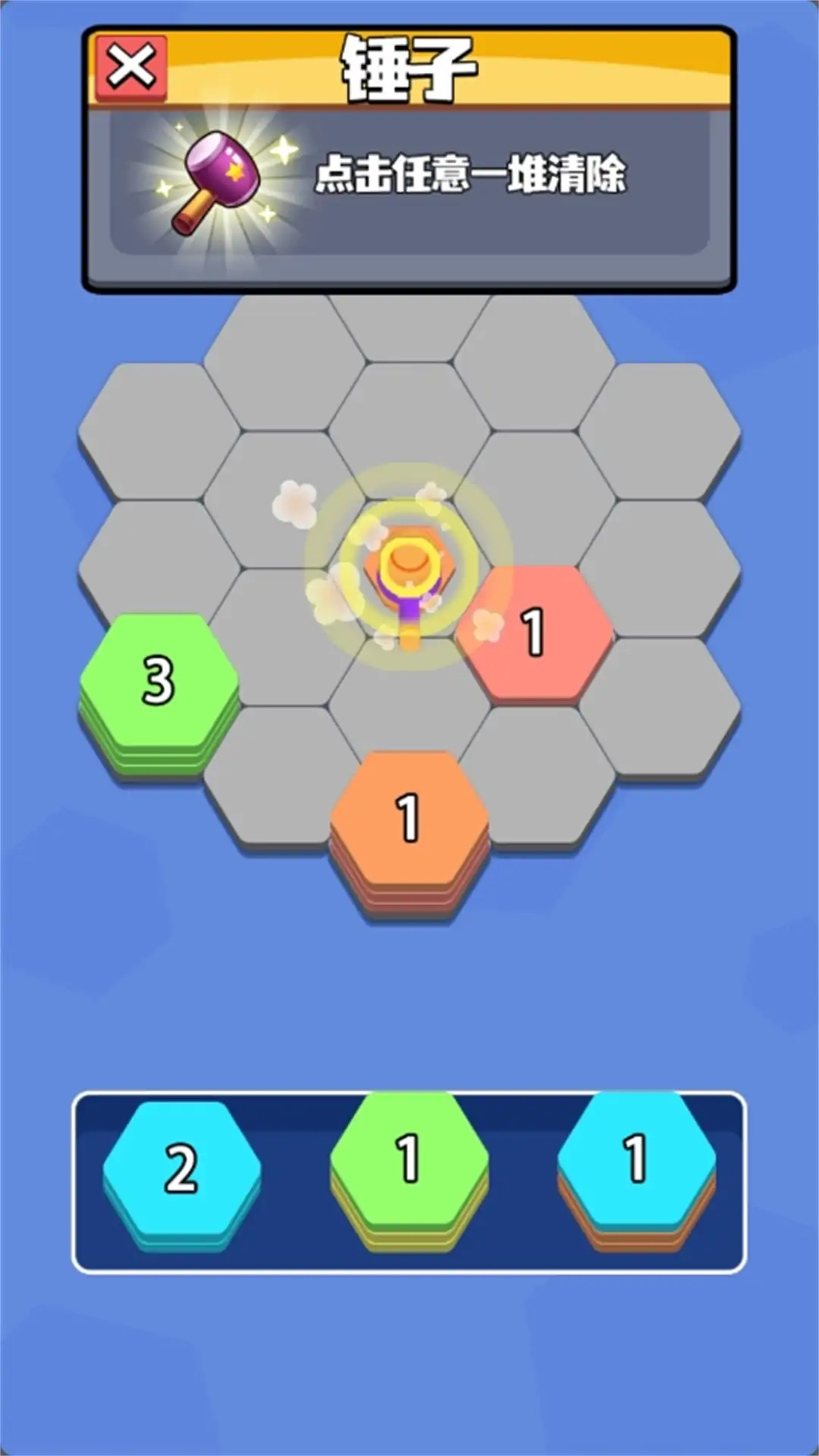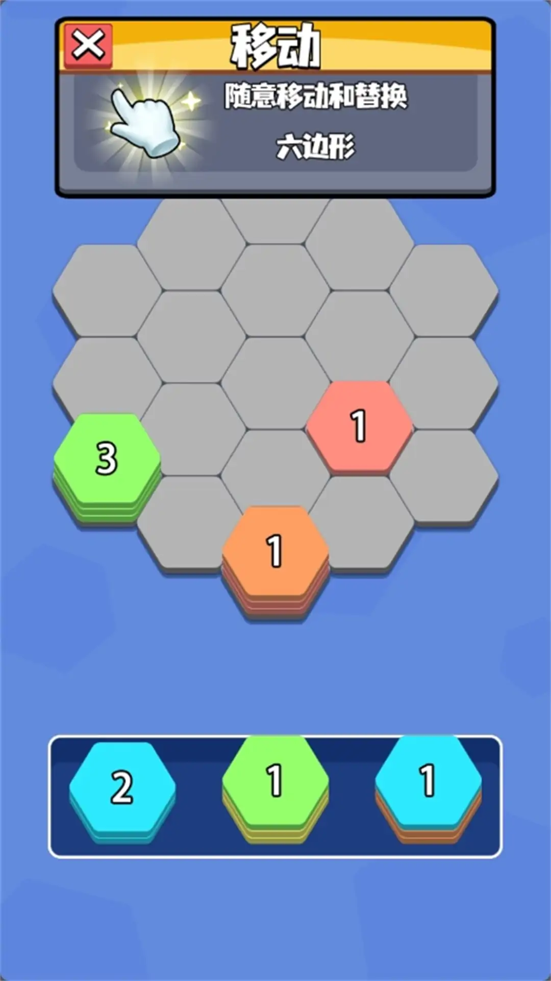 将六边形移动到空格上,相同颜色的方块即可消除,完成合并的次数越多,获得的分数也就越高!达到关卡目标后,你将挑战更高难度的关卡。