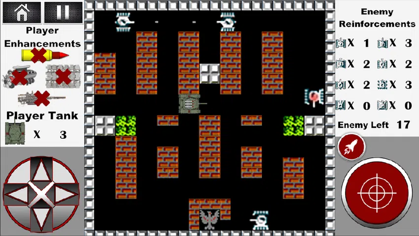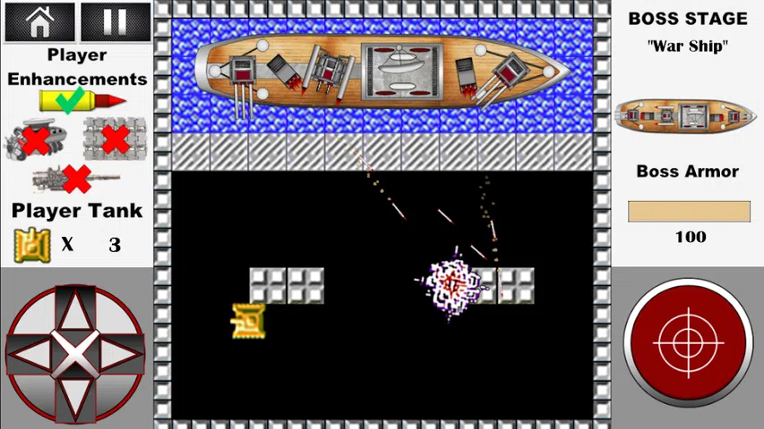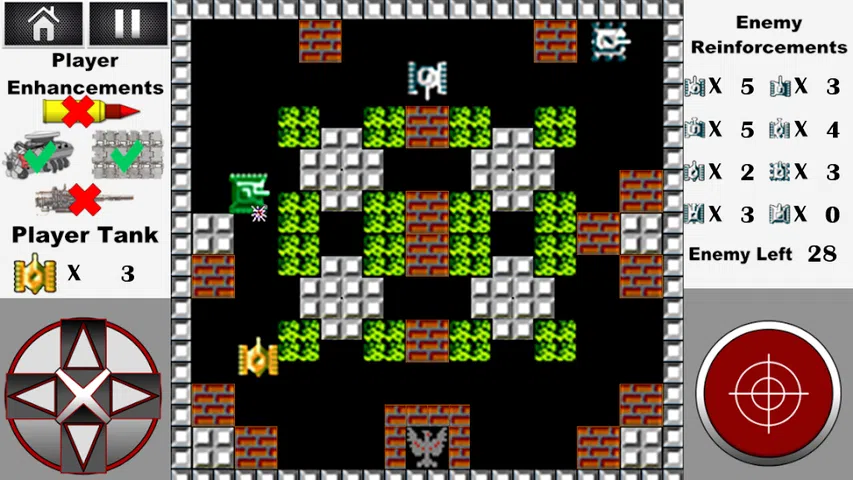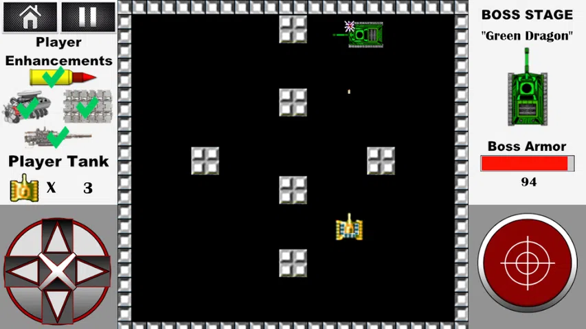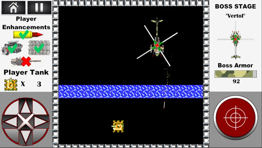 以坦克世界1990为基础的经典游戏大战城市! 自 1985 年以来以其崇拜而闻名。 在 World of tanks 1990: Operation of tanks 中,玩家的任务是摧毁所有敌方坦克并保卫你的基地 - 鹰! 坦克世界1990除了经典版新增战城 升级玩家的坦克 买新坦克 每十级后老板战斗! 每个级别的玩家都会获得金币,您可以购买新坦克并升级它们! 升级你的坦克: 1. 装甲—穿甲弹穿透了该位置的装甲,一击摧毁装甲的敌方坦克。 2.引擎调整—玩家坦克提升30% 3. 带铰链的盔甲会承受第一次用玩家坦克中的射弹击中敌人的伤害。 4. 快速充值—增加玩家坦克30%的充值率 5. 导弹发射器—锁定敌方坦克和一枚制导导弹。 6. 齐射火箭发射器—发射三枚火箭,每枚火箭都瞄准单个敌方坦克。这使您可以一枪摧毁三辆敌方坦克,或者对首领造成实质性伤害! 购买坦克玩家。六款经典坦克供您选择,每款都有自己的属性和特点: • 速度 • 盔甲 • 移动速度 一辆高级坦克—“沙漠风暴”: • 高射速 • 坚固的装甲 • 高速 • 旋转塔,将敌人引向杀戮区,让您可以击中位于玩家坦克侧面或后面的敌方坦克! 你必须在十五个地点与敌方坦克作战,选择他的每一种战术。 增加。 全游戏 50 个经典关卡和 5 个老板关卡 在老板级别没有玩家鹰的总部。唯一的任务就是消灭对手! 每个老板都有其独特的战术和武器: 1. 绿龙是一款经典的坦克,拥有旋转炮塔、重型装甲和快速装填。 2. Double Dragon – 两辆速度快、机动性强的坦克在旋转炮塔中平均保留和平均装填速度。 3. 配备两门速射炮和寻的导弹发射器的 Vertol 直升机。 4. Big Shot—重型、大型、双塔坦克,配备齐射火箭发射器和增强型装甲。 5.战舰—一艘战舰,配备两门速射炮、两门火箭炮、多门火箭炮和一门重型火箭炮! 祝你好运和许多胜利