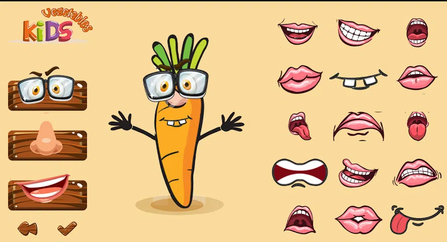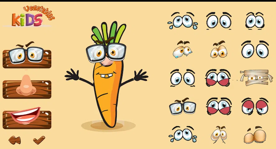 Kids Vegetables 是一款免费的教育游戏,适合 4 岁及以上的儿童,与您的孩子一起选择合适的蔬菜角色: 1- 眼睛 2-鼻子 3-嘴巴 4-蔬菜 5- 你的消息 您可以一边观看蔬菜的精彩图片,一边学习它们的名字! 独特的互动声音会鼓励孩子,例如泡泡声、欢呼声和掌声