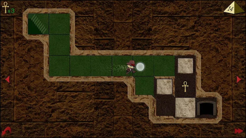 通过移动石块、触发秘密通道、收集宝藏和避开陷阱来到达另一侧。打发时间的轻拼图。 挑战来自于只能移动玩家可以触及的方块,你不能越过它们,更大的方块不能穿过狭窄的走廊。 关卡变得越来越复杂,包括由重量或特定象形文字触发的秘密通道。 别忘了沿途收集宝藏,但要当心陷阱