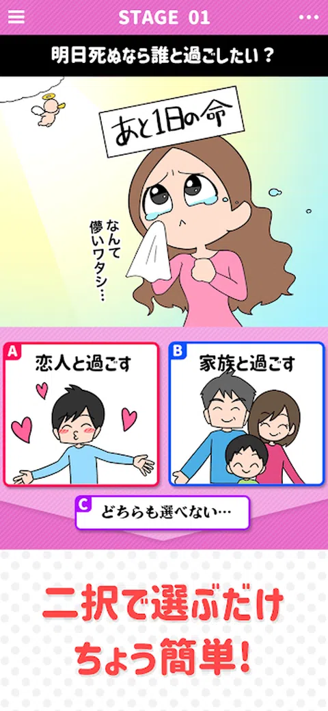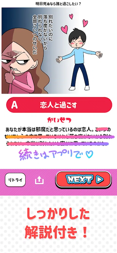 您可以通过两种选择轻松诊断 一个有趣的心理测试应用程序就在这里! 因为它比较 你可能会认真考虑.! 是的,没关系! 即使您认真考虑它也很有趣。 您可以直观地选择它! · 怎么玩 1.仔细阅读问题 从两个或两个选项中选择你认为的这个 3.您的诊断结果将立即显示在结果屏幕上! 4.如果不能选择,请按“我也不能选择” 5. 插图很可爱,很有趣! 欢迎本应用直播! 我们一起玩吧