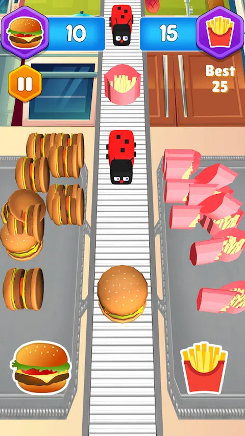 汉堡工厂是一款非常简单的游戏。 您所要做的就是熟练地分发美味的汉堡和薯条! 好的食物会吸引昆虫。小心,因为他们会吃掉所有东西。 对众多汉堡和薯条进行分类,并尝试创造新记录