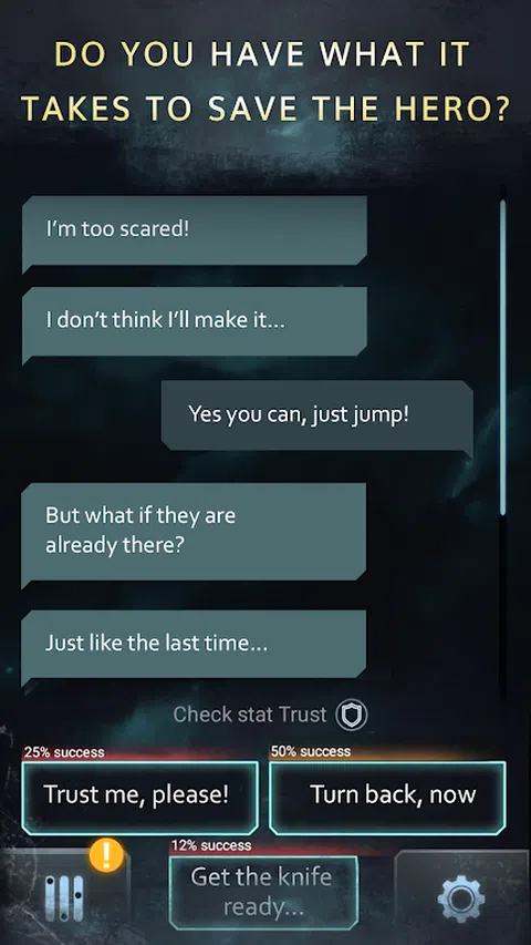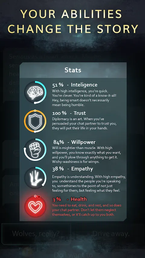 跟随你的新聊天伙伴克里斯 - 一个从过去逃离并随之而来的不幸的受害者。在废弃的商场里寻找安全的庇护所,在黑暗中逃离危险,只有在你的帮助下才能解开这个地方的谜团。 做出正确的选择、细心、观察力和机智将帮助你解决谜题并引导克里斯到达安全地带。但是,请注意 - 您的某些行为可能会产生不可预测的后果。 特征: - 完全免费玩主线故事! - 从许多可用的响应选项中进行选择 - 创造你自己的故事并与克里斯建立关系 - 管理克里斯的健康,避免身体和精神上的伤害 - 身临其境且细致的谜题 以黑死病为背景的黑暗科幻小说《寂静》和《终点站》的作者特里斯坦·帕尔姆格伦加入了开发团队,为您带来了这个互动故事,您所做的选择可以改变一切。游戏中的多条路径会给你带来截然不同的结果—从浪漫到令人兴奋的曲折。谁会活,谁会死? 借助新的检查点系统,您可以将时间倒回到几乎任何您想要的消息,并重播故事以体验不同的故事分支,甚至故事结局。 管理统计数据,包括新的健康表,以解锁新路线并发展您与 Kris 的关系。统计数据的变化会响应你在游戏过程中的选择